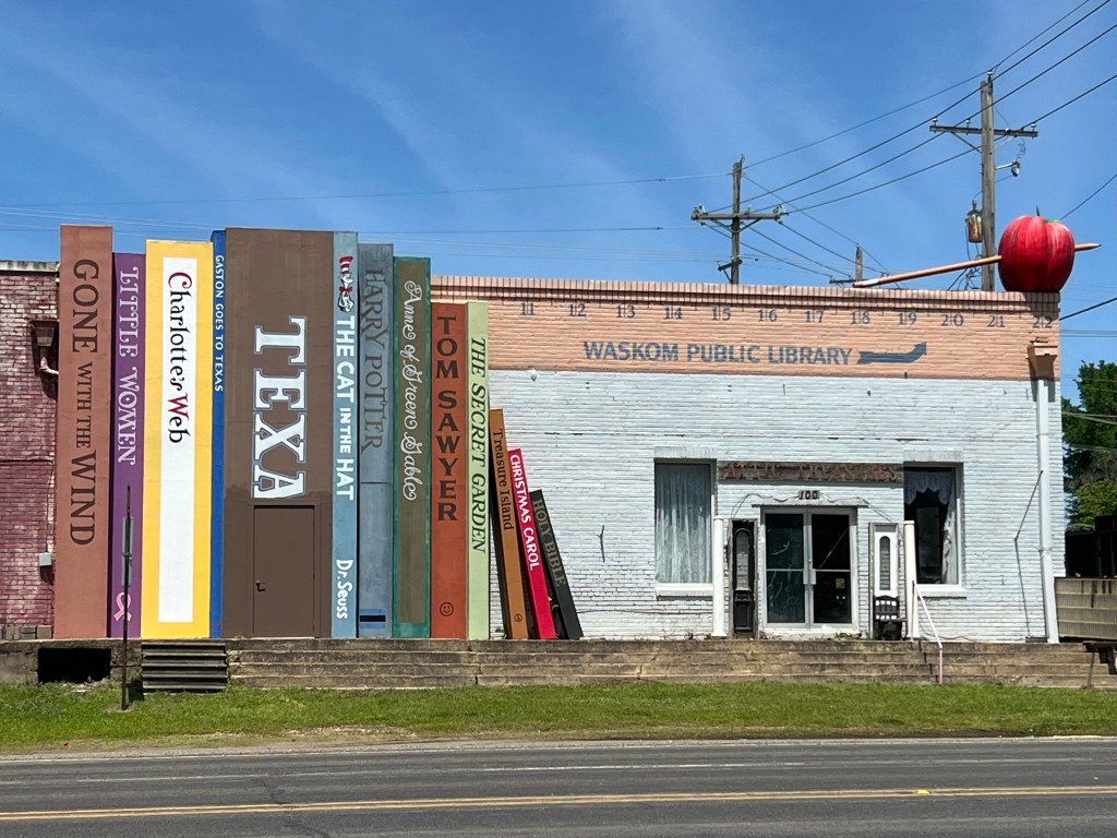 - Headed from Chevron on over to Waskom to get a view of Big Books, Apple, Ruler, Pencil mural that is on the side of the Waskom Public Library at 100 Texas Ave., Waskom, TX. The mural is there to draw attention to the town library. The books are 22 feet tall. What can I say, I like transformers and books!