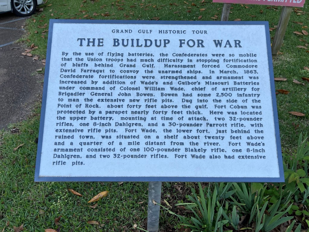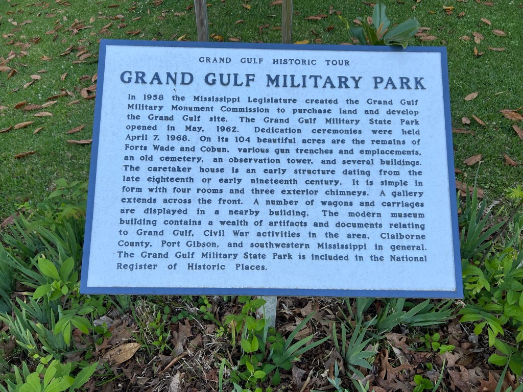 - 7:30am and the coffee had been drunk and the donut has been eaten so it’s time to hit the road! Heading south the first stop is Grand Gulf Military State Park by Port Gibson. The physical address is 12006 Grand Gulf Rd., Port Gibson. The drive out to it is beautiful and the Military Park is pretty darn neat. I didn’t spend nearly enough time there. I did go through the small museum display and drove through it but due to time constraints I didn’t have time to walk through some of the trails/buildings like I would have liked. Fun fact you drive by a nuclear power station on your way to the park. To me the coolest thing they have at the park is a One Man Submarine that was powered by a Model T Ford engine. It was used during early prohibition to bootleg whiskey and rum from Davis Island to Vicksburg! Make sure you check out the pics of the submarine and other items. Can you imagine being in this thing running bootleg whiskey?
