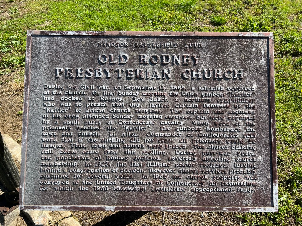 - The main attraction for me in Rodney was the old Presbyterian Church. You can read the history of it below. I did not go inside as you’re not supposed to however, I was incredibly lucky as when I rolled into town there were a couple people working on the church who gave me permission. Probably in their 70’s and very familiar with the area as they grew up in the area. We had an absolutely wonderful discussion about the history of the area and their memories from when they were kids and the stories about the area that their parents had shared with them. I learned quite a bit about the floods they had in the area, how Rodney was almost the state capital, how Grant tried to change the course of the river (and failed), how Lincoln set back three shiploads of slaves of which some stayed in the Caribbean, cotton tariffs, and much more. Continued below.