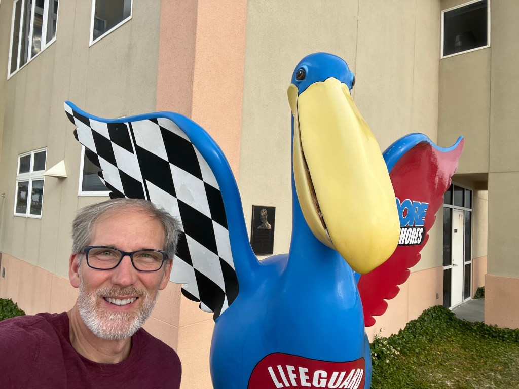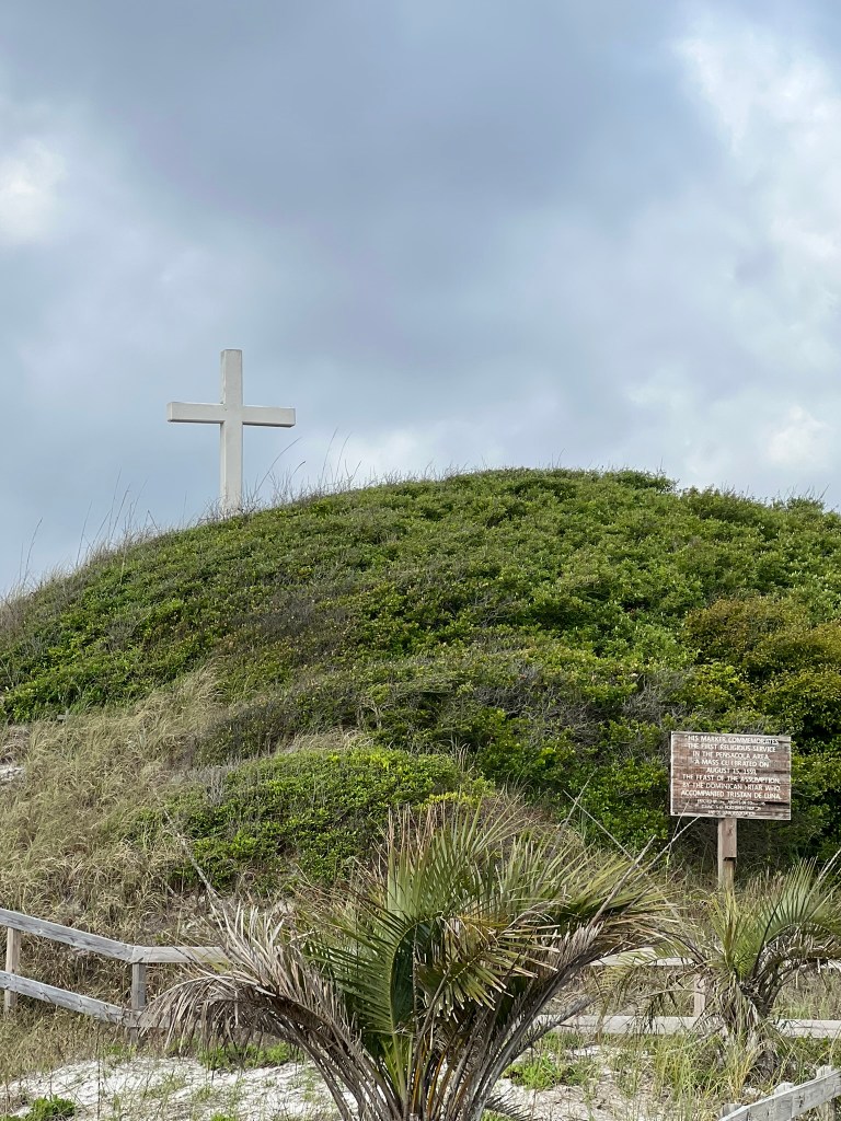- Continuing on Fort Pickens Rd. was a quick stop at Pensacola Beach to check out the sand and grab a couple quick pics of the Surfer Dude Statue and the lifeguard pelican statue. Great looking beach with nice facilities and a lot of people come here. I like quieter beaches personally. Surfer Dude Statue is a statue of Yancy Spencer III, “the Duke of the Gulf Coast” who made surfing famous in Pensacola Beach. It’s located right by the beach at 3 Casino Beach Boardwalk, Gulf Breeze. The pelican Statue I just thought was cool so took a picture and it’s right by the Surfer Dude. Next stop was only a mile or so down the road on the south side of Fort Pickens Rd. at 495 Ft. Pickens Rd. The site of the Indestructible Cross: First Catholic Mass. This is a 10 foot high cross on top of a sand dune that marks the spot of the first Catholic Mass in the U.S.A. on August 15, 1559. Hurricanes have never toppled it over.