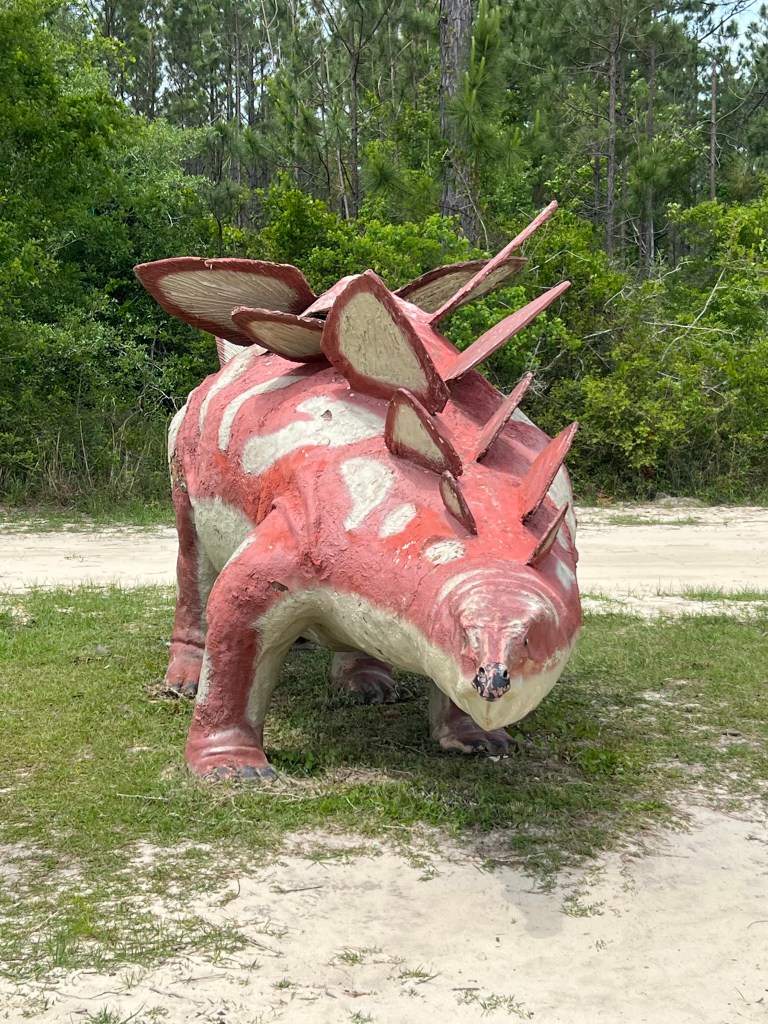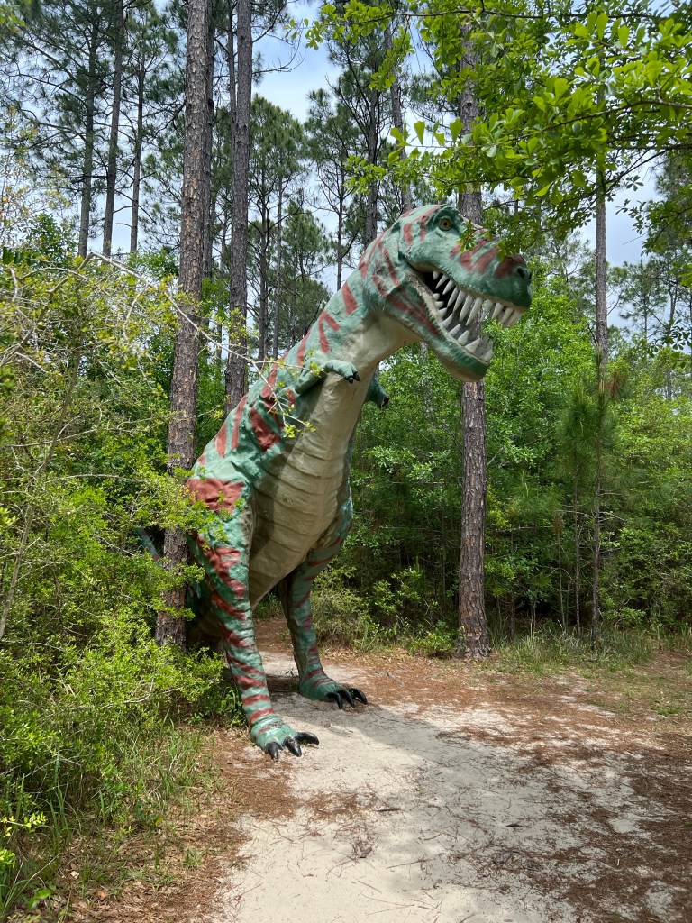 - Next up is dinosaurs! As you drive down the road towards the marina keep an eye out for these critters. There are several of them hidden in the trees on the side of the road ready to come out and “grab” you so keep an eye out! I didn’t stop at all of them so you’ll have a few more to discover as you go. Be careful petting them, one of the wild ones tried to take a “bite” out of me. lol