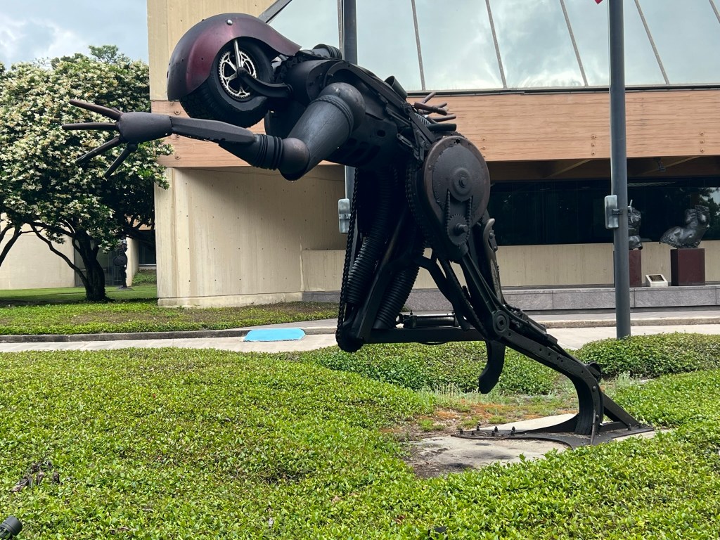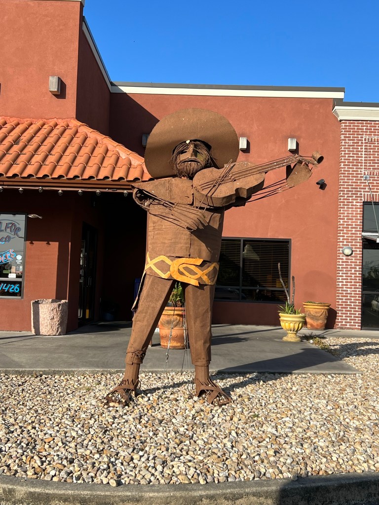 - First stop is just up the road (well west on the road) to see a Giant Crawfish Sculpture that is at 1905 Rees St, Breaux Bridge, LA. Made out of metal and standing on it’s tail at Crazy ‘Bout Crawfish (wish it was later in the day so I could try to grab me a bite here). Bonus for me on the same street the local Mexican restaurant made a mariachi player to compete or maybe to woo the crawfish away???