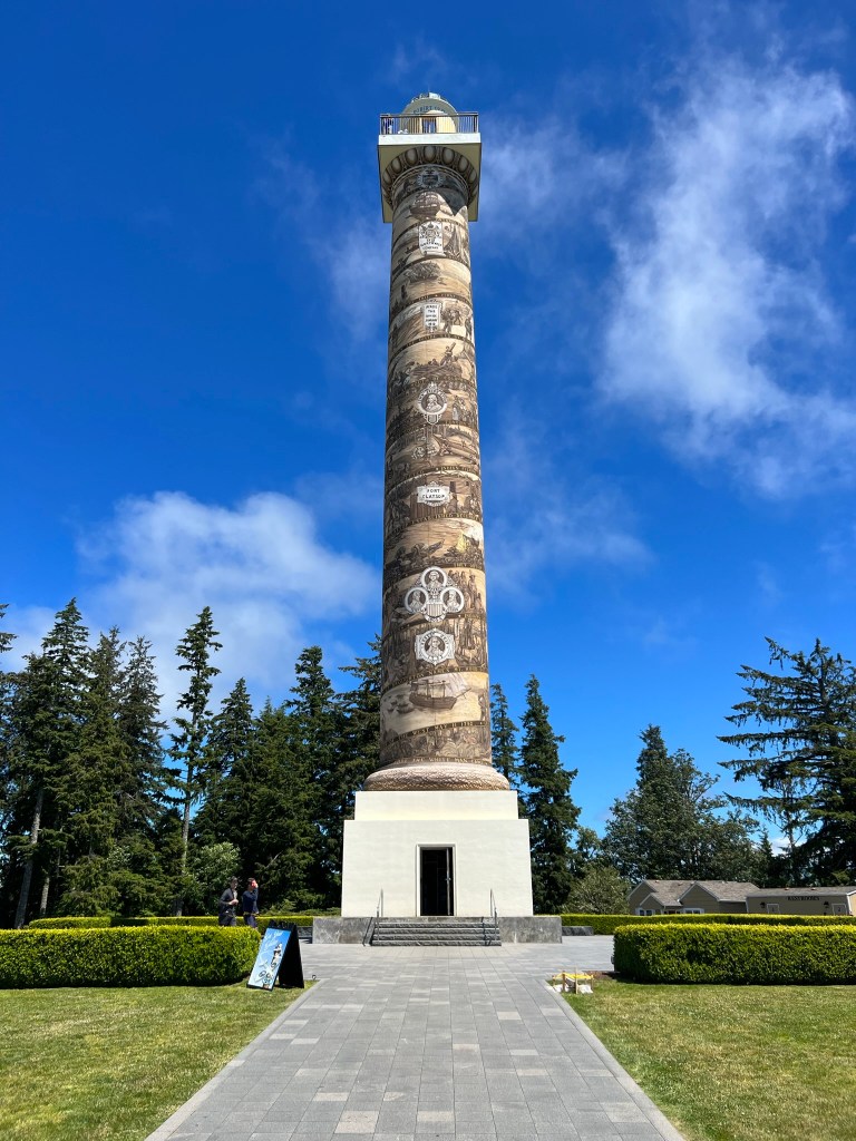 - Having gotten a little history at the museum we went on to The Astoria Column so we could get up high and see some of the beautiful views. The Astoria Column was completed in 1926 by the Great Northern Railroad and Vincent Astor. Vincent was the great-grandson of John Jacob Astor, who founded Astoria. This monument depicts the discover and settlement of the Columbia River until the arrival of the railway. Once you climb to the top we could see Mt St .Helens and Mt Rainier amongst other awesome scenery. Lot of people came here to just picnic and spend some time looking at the views. Be aware that you have to pay for parking! Stuck around here until about 2:15pm and then back on our way to cross the giant bridge and into Washington state