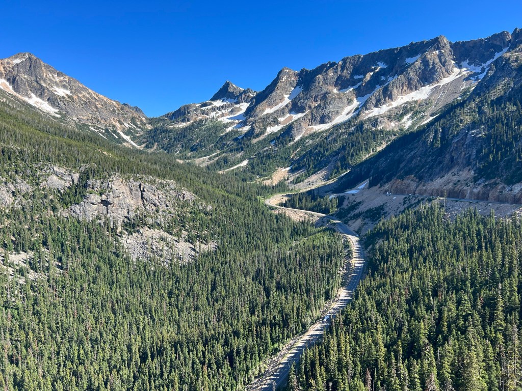 - We stopped at the Washington Pass Observation Site which is a scenic overlook halfway through the pass and did a short hike to check out the views. Snow capped mountains! Snow on the ground! Beautiful blue green water! Gorges!!!! Doesn’t get any better than this!! Make sure you click on the pictures so you can see them full sized on this!! The road you see from up high in the third picture is the same road from the first picture. You go up pretty high!