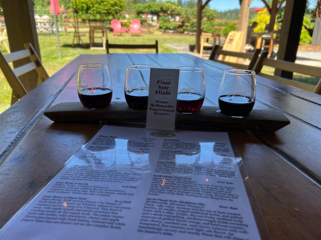 - Moving on down the road next stop was the Spoiled Dog Winery to try their Pinot Noir. Beautiful winery and setting. We tried a flight of their Pinot’s as I really wanted to sample them due to the climate on the island. They were acceptable. I liked the Pinot Noir-McMinnville the best. Definitely worth a stop.