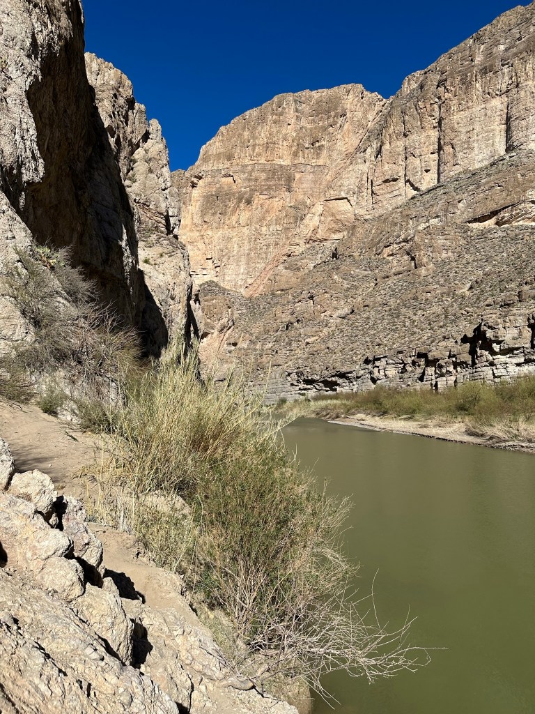 - Backtracked from there to the Boquillas Canyon Overlook which gives a superb overlook to the area. Dropped down a little further to the Boquillas Canyon Trail to have a wonderful hike by the Rio Grande in the Canyon. Very nice with great canyon walls and all the rest. Bit steep at the beginning but well worth the effort. Make sure and check the trees out as you get to the bottom. We had a couple that were back in the trees giggling and having fun when we hiking by. We kept hearing something in the trees when we walked by and thought maybe a horse or something but then they came walking out so I guess it was just them. lol. I didn’t do a very good job of picture taking here so don’t judge the Canyon by my picture!