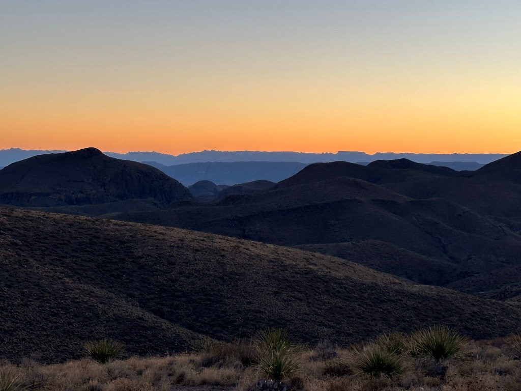 - First stop on Ross Maxwell Scenic Drive was Sam Nail Homestead. Short little hike but pretty. Drove on down the road to Homer Wilson Ranch Trail. We started to hike it and got about half way down and decided to postpone the hike so we’d have enough time to see Castolon. Next stop was Sotol Vista Overlook to get a feel for how sunset would look then on to Castolon. Ok… we did this part of the drive in about 20 minutes and I totally didn’t do it justice. I need to drive it again to really appreciate as it was just stunningly beautiful. We got to Castolon about 5:15pm and everything was closed so we ended up just driving back to Sotol Vista so we could see the sunset. The sunset there was beautiful and I took way to many pictures so now I have to do the painstaking task of vetting them out. Back to the Chisos Mountain Lodge where we were able to sit in the bar area and grab some dinner. Dinner was very good. I had the steak and it was excellent! The waitress was wonderful and her attitude and speed of service was much appreciated after a long day out!