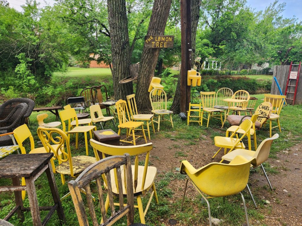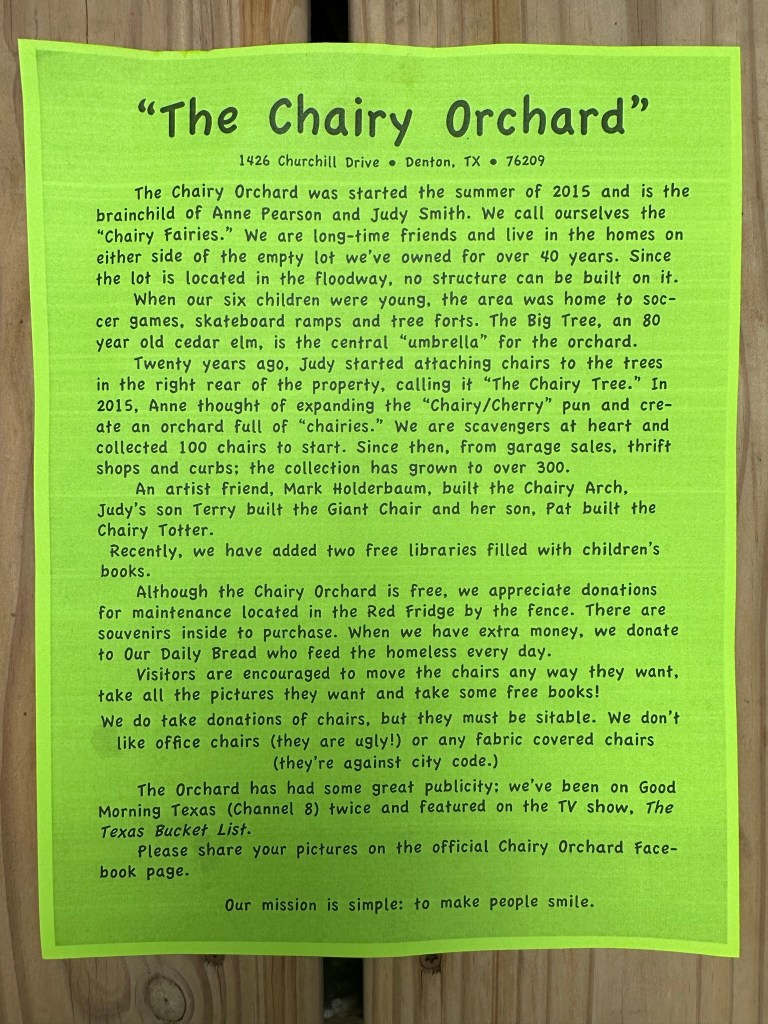 - The Chairy Orchard is just one of those fun stops. A couple of neighbors go together and did it since they couldn’t do anything else with the lot (the lots in a flood plane). Pretty darn cute! I love the Lemon Tree.