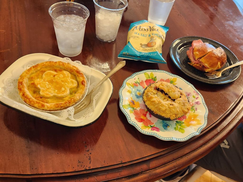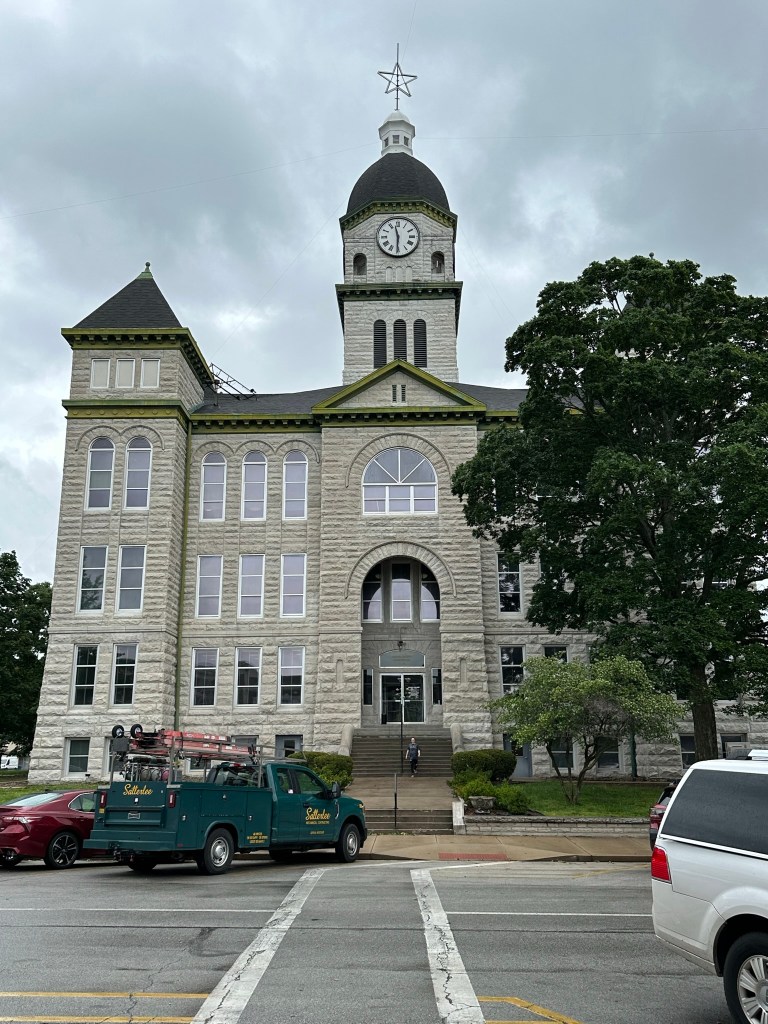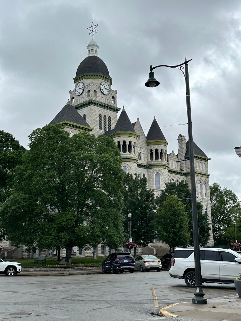 - Starting to feel a little peckish we decided to do a sit down meal at The Pie Safe in Carthage, MO. Evan had the chicken pot pie while I had a roast beef sandwich. We split the blackberry pie for desert. The chicken pot pie was the all star winner by far and I happily nabbed some of it for my culinary delight. The blackberry pie needed a touch more blackberry but it was very good. It tasted like they had used a sugar cookie dough shell for the pie; I’ll have to try that one day. The roast beef sandwich was well….a roast beef sandwich. I think I’m just going to start ordering whatever Evan orders as she seems to be having better luck than me on this trip. While we were waiting for our order I stepped outside and took a couple pictures of the county courthouse across the street.