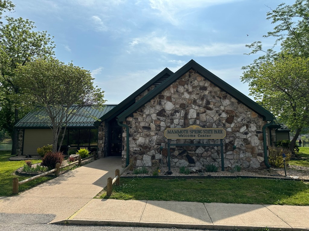 - Arriving at Mammoth Spring State Park around 10am we took a quick walk around, looked at the lake and the old dam located there. Both are right behind the Visitor Center which was very clean and nice. Several muskrats were swimming in the lake much to our viewing pleasure. Them and the ducks had a whole thing going on while we were there! The whole area was very pretty and several people were coming and going during the short time we were there. Admission was free. Evan and I thought the area was pretty enough to warrant an extended stop next time we were in the area.