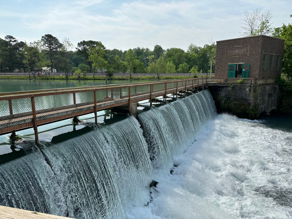 - Since we were up late last night we ended up getting a much later start this morning than we had planned on so while we were some delayed it didn’t dampen our enthusiasm. We had our hotel breakfast, hopped in the car, and started driving to Mammoth Spring State Park right which is right on the Arkansas/Missouri border. I felt so bad for Evan as it was a beautiful drive in spots but she had to stay looking down for most of the journey finishing up a project. Fortunately I was able to help her out by periodically spotting a yellow car and yelling out “No tag back”…..she was not amused. Lol