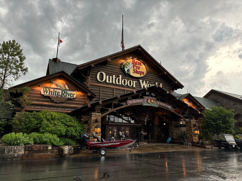 - After that we bought a couple items we discovered we couldn’t live without and then braved the rain to drive a couple blocks over to the Angler’s Lodge Bass Pro Shops to spend the night. It’s across the street from WOW so a great location to spend the night if you’re going to go there or be late from going through it. Cost wasn’t bad as we paid about $140 for a double queen bed and a complimentary bag of gummy worms. The rooms were comfortable, clean, and quiet. They are promising a great breakfast in the morning so we’ll put that to the test in the morning.