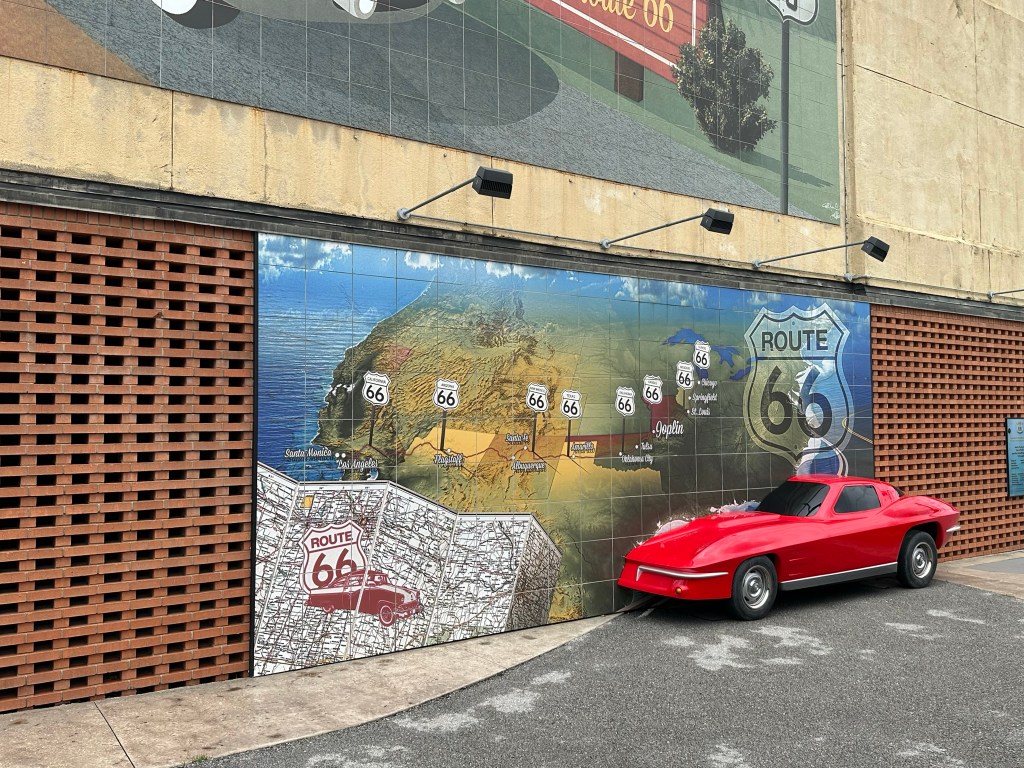 - Next we were on the road to Route 66 Mural Park in Joplin, MO. We had stopped in the parking to get a picture but there was a group of bikers already there that were going through one at a time to get their pictures so we had to be fast on the camera trigger as they were waiting for no man or camera! I think we did pretty good for the split second we had to work with.