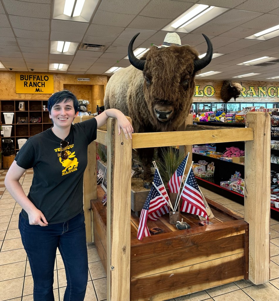 - Further on we went with a smug feeling in my heart to Buffalo Ranch truck stop where there was a stuffed buffalo, a long line to check out, and no more real buffalo but we still got our action shot!