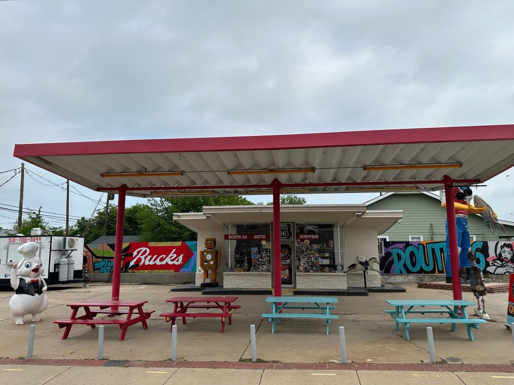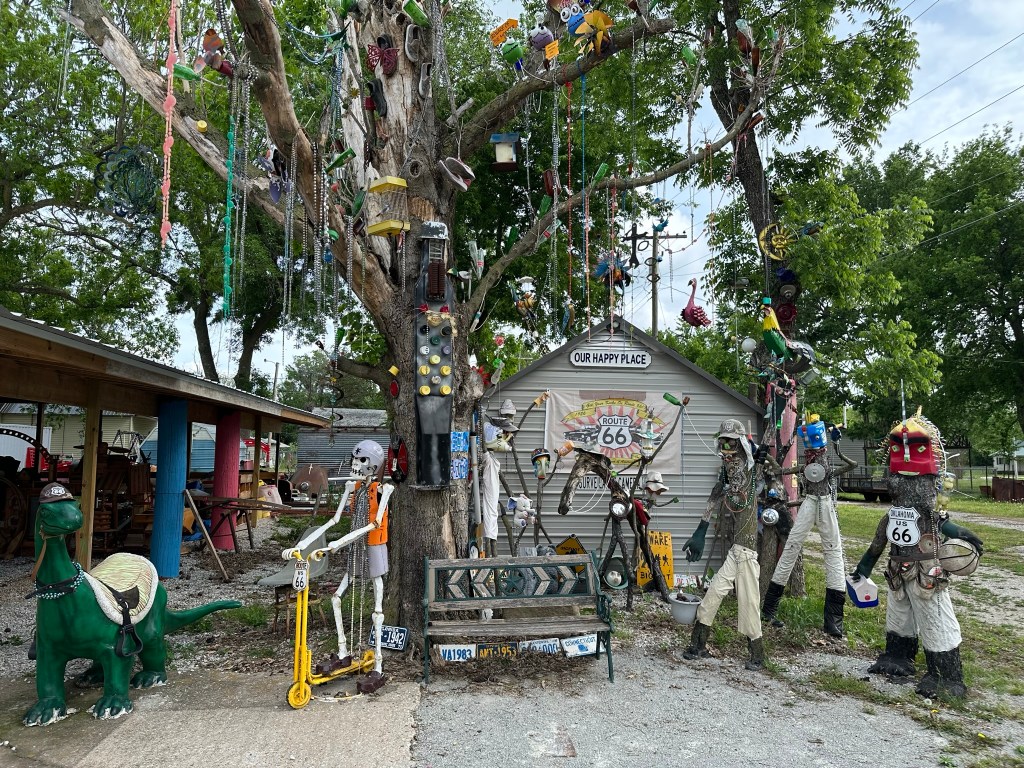 - Leaving Buffalo Ranch with no buffalo we made a quick roadside stop in Afton to take pics of funky Route 66 place. It was well worth the time as we got Evan’s dinosaur photo here that is on the top of the page. Here’s some other pictures from here. I really liked this place. They had a little bit of everything and a whole lot of something!