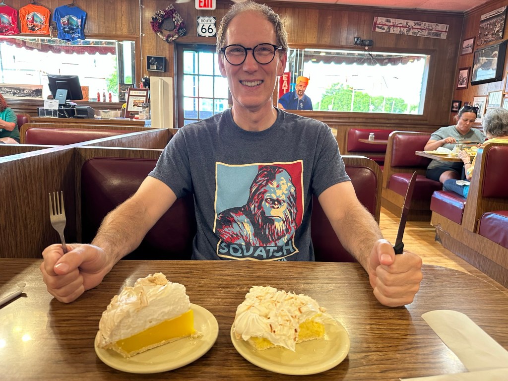 - We weren’t really hungry but the pie famous Clanton’s Cafe was just up the road so we had to stop to try the pie. After much deliberation and help from the lady sitting across from us we picked the lemon meringue and coconut cream pie. The coconut cream pie was the winner for us. The lemon meringue was to “solid” for our liking although it was still good as we managed to power both slices down. To full!!!!!