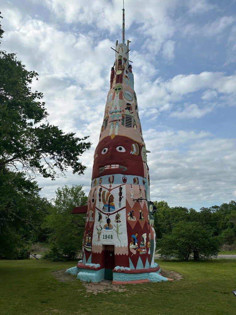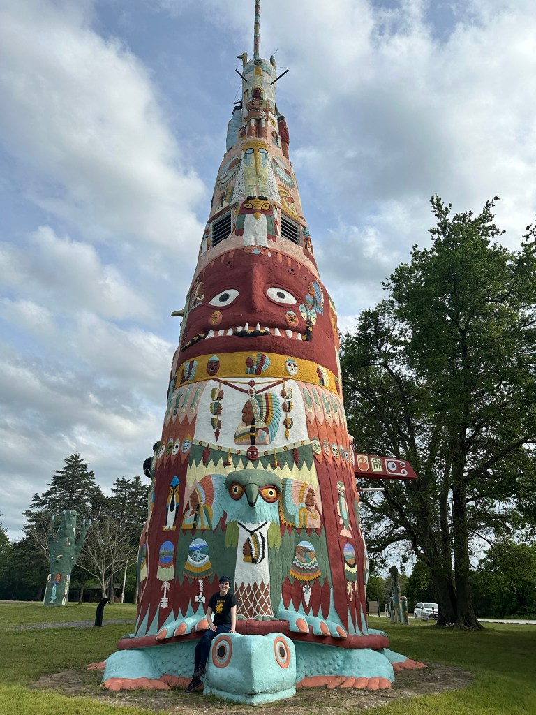 - Looking at the clock we realized it was about 6pm and we still had places to go so back in the minivan and off we go to Ed Galloway’s Totem Pole Park. Everything was closed when we got there but we wandered around and took a few photos. There are eleven objects on the 14 acres as well as a building. We only took pictures of the large totem. It actually was a group effort as one of the neighbors was coming out of their driveway, stopped, and asked us if we’d like our photo’s taken. Thanks again to him!!