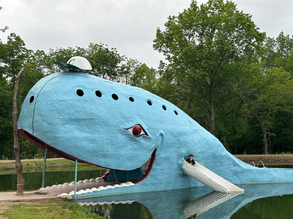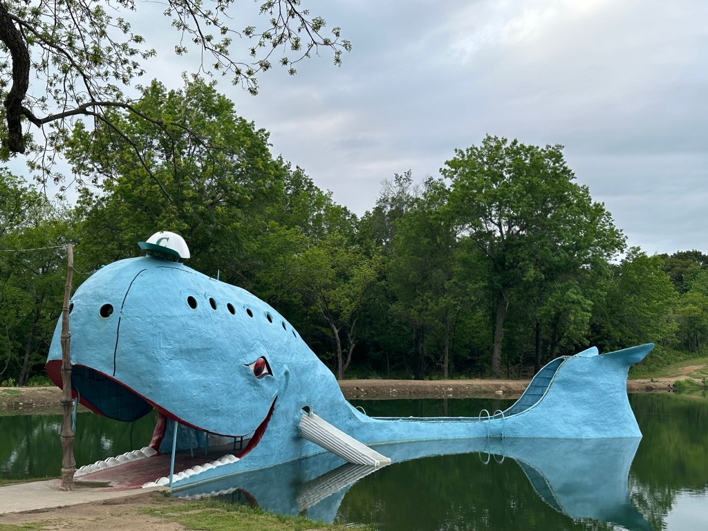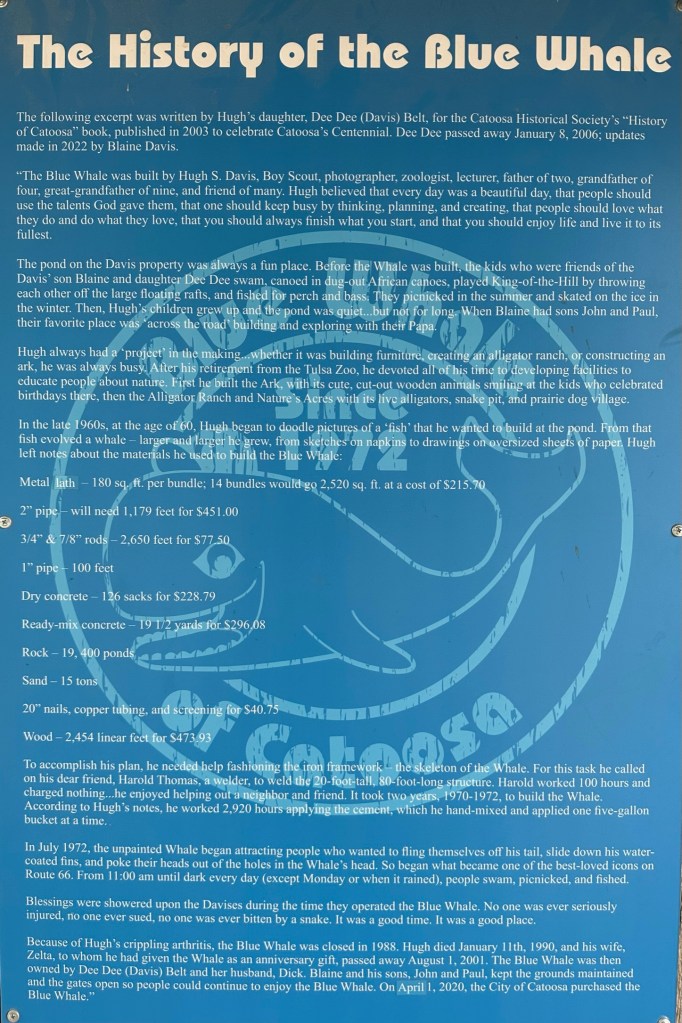 - Driving on down Route 66 we passed by the furthest Inland port in the USA in Catoosa and then stopped at the Blue Whale in Catoosa, OK. The Blue Whale was built by Hugh Davis in the early 1970’s. I’ll post a picture with the rest of the history in it for you to peruse.