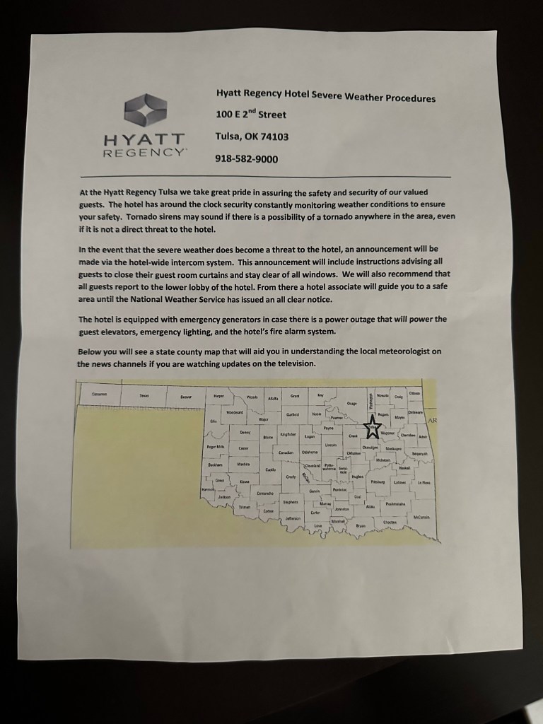 - I think Evan was a little edgy though and not just from the application pain. Oklahoma gets a lot of bad weather and tornadoes so when you check in the hotel gives you a sheet of paper telling you what the procedures are in case of bad weather. Nevertheless it didn’t stop us from getting some rest and I thought it was a very informative touch as well as very safety conscious so it was much appreciated.