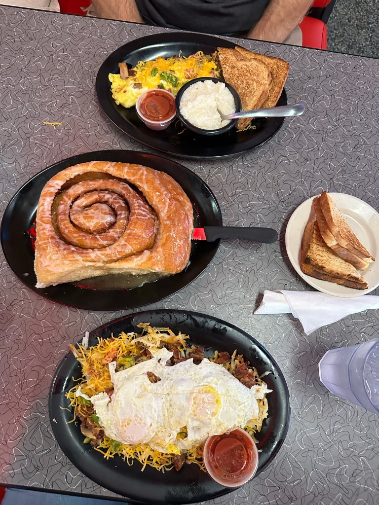 - The best food of all though, just in case you’re still hungry and if not maybe start with it, is the homemade cinnamon roll. It’s a giant cinnamon roll the size of a dinner plate and it tastes fantastic! Right amount of sugar, cinnamon, and baking make this magic. Evan and I shared and loved every bite.