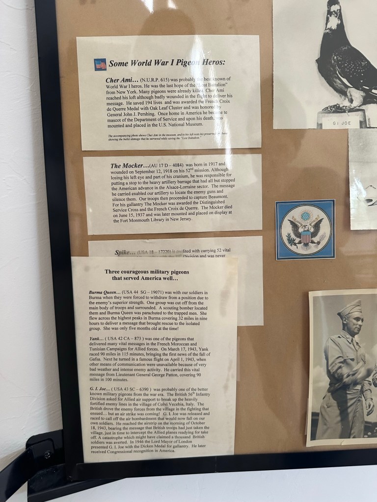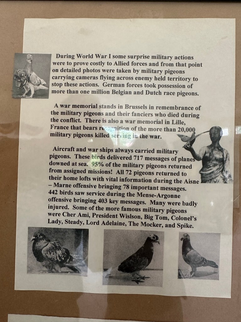 - The American Pigeon Museum had more information on pigeons than I ever dreamed. I never realized how many different types of pigeons there are and how competitive the competitions get. The use of the pigeons for sending messages in World War I (and before and after) was incredible. It was like nothing I imagined. Evan lost her mind when the woman working the museum told her she was putting the pigeons up for the day and asked her if she wanted to watch. Evan really lost it when she let Evan touch the pigeons as she was holding them. It was one of those “wow” moments. I don’t remember which type of pigeon each one was but here they are along with a lot of historical war info. Some of the pigeons in the war were true war heroes and recognized as such!