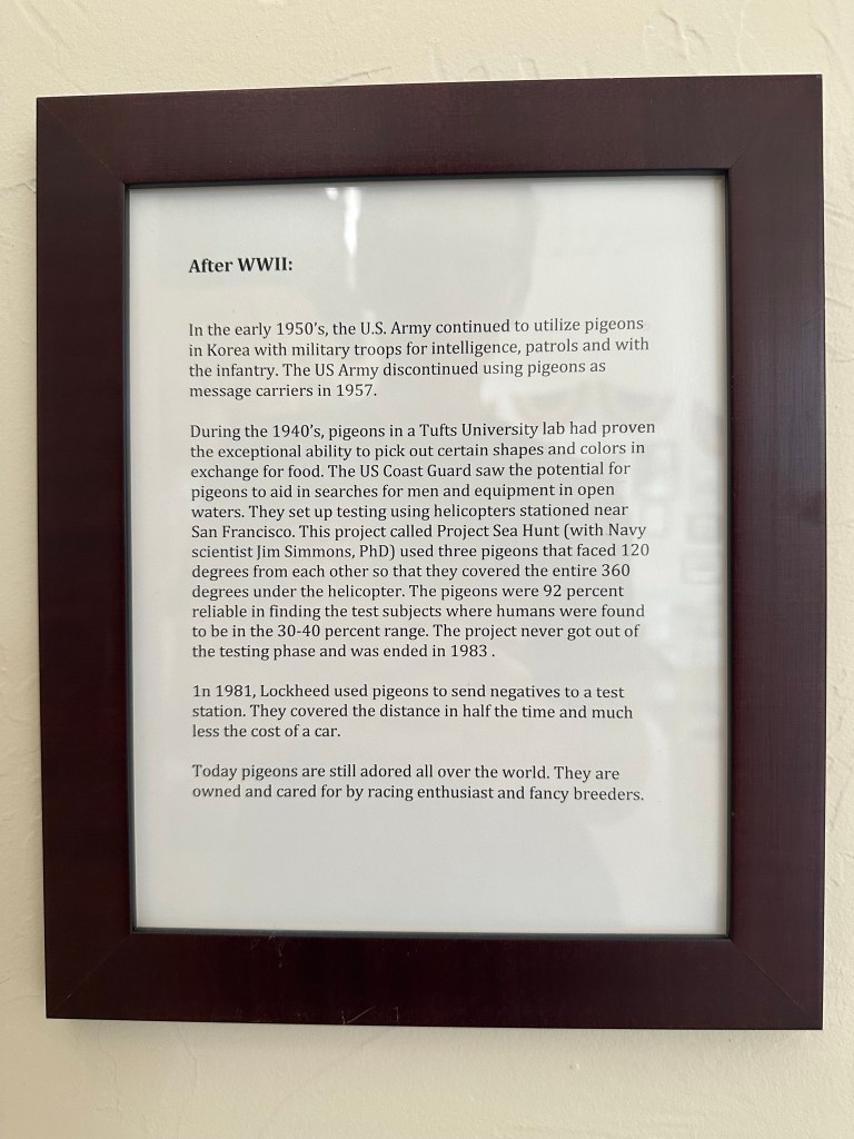 - Before you ask the pigeons are kept in the cage to prevent them from flying away. Not all pigeons come home to roost. (Yes, I’m proud of working that in here). They are very well taken care of so no worries on that front either. Without further ado here are the stars of the museum.