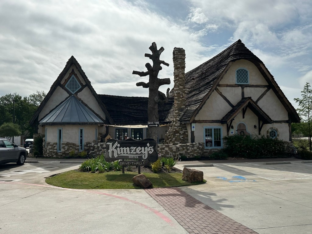 - Kimzey’s Coffee Shop in Argyle, TX has a cool shape like old time fairy tale coffee house. It’s a beautiful place that has had a lot of thought put into it. They food and coffee are both good here. We got a huge kick just out of walking in the door.