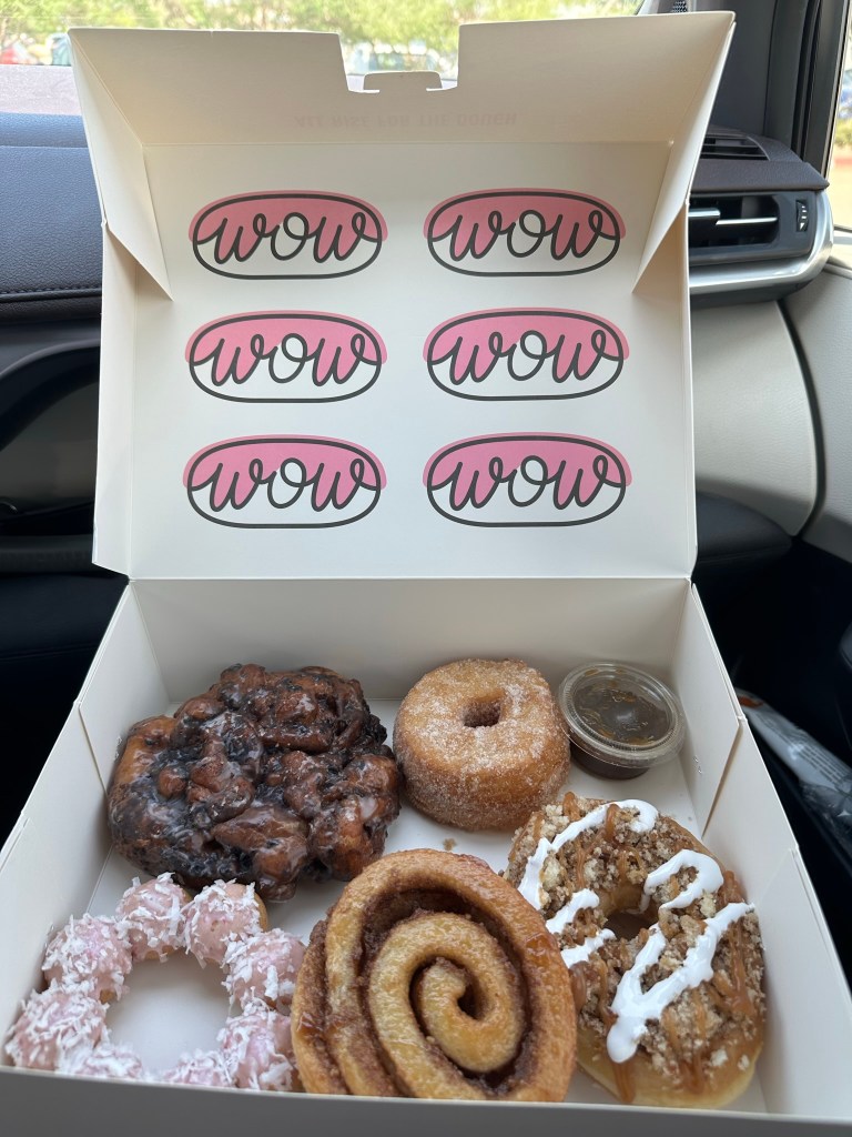 - You’d think we would be full by now after everything but nope. Evan had researched out WOW Donuts and Drips. It’s a shop in Frisco that has some really good artisan donuts. We bought a few and immediately sampled them when we got in the car. The flavors we picked were Blueberry fritter, cinnamon sugar cronut, sticky bun with toffee sauce, strawberry coconut mochi, and a biscoff donut.