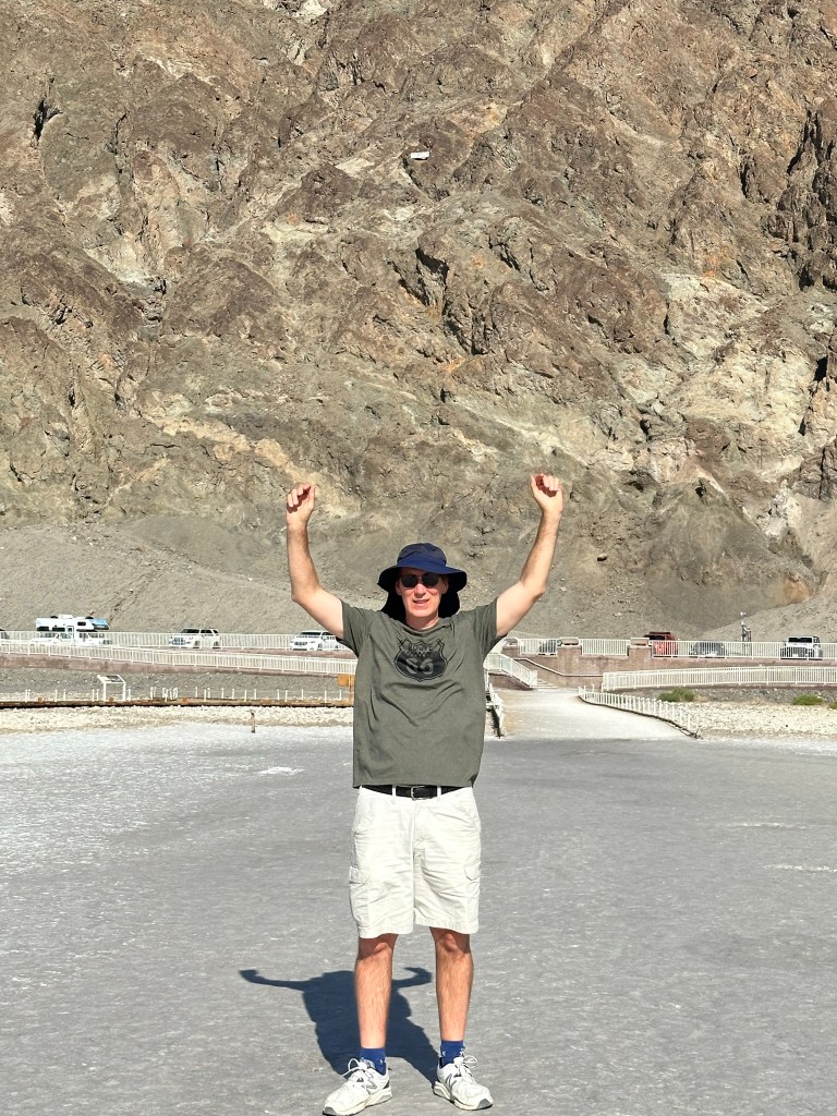 - Here’s the good stuff! See if you can spot the really, really small sign in the background about halfway up the mountain. I’m pointing at it with my hands. That sign is at sea level and I’m standing 282 feet below that!