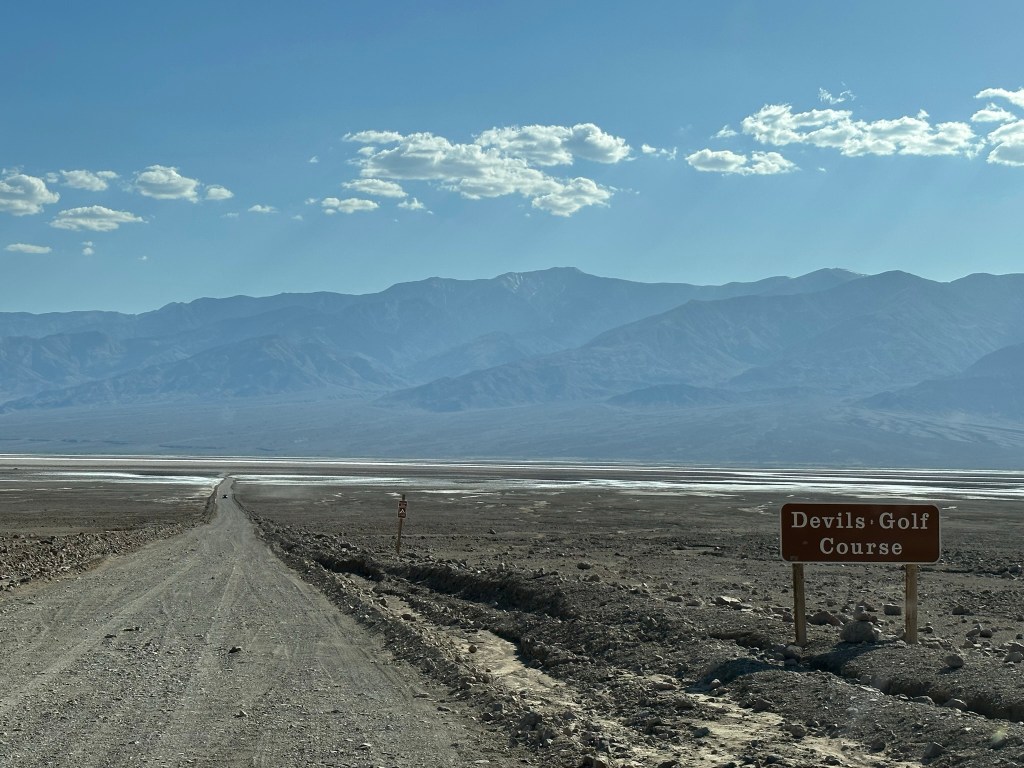 - Leaving Badwater Basin we stopped at the Devil’s Golf Course just up the road. Devil’s Golf Course is made of crystallized salts that make some very jagged formations. The salt comes from the ancient salt lakes (remember this was all lakes) and the structure was created by the winds and rain. On a warm day you can hear the salt pinnacles expand and contract. They make a metallic cracking sound or as I like to call it a Rice Krispy snap-crackle-pop! The salt is replenished by recurring floods that occasionally submerge the lowest parts of the valley floor so it’s an ever changing place. Be careful if you walk out there as they are very sharp, jagged, and cutty…lol Seriously, people have gotten lots of cuts and even broken bones from being careless here. It’s called the Devil’s Golf Course because he’s the only one who could play on it.