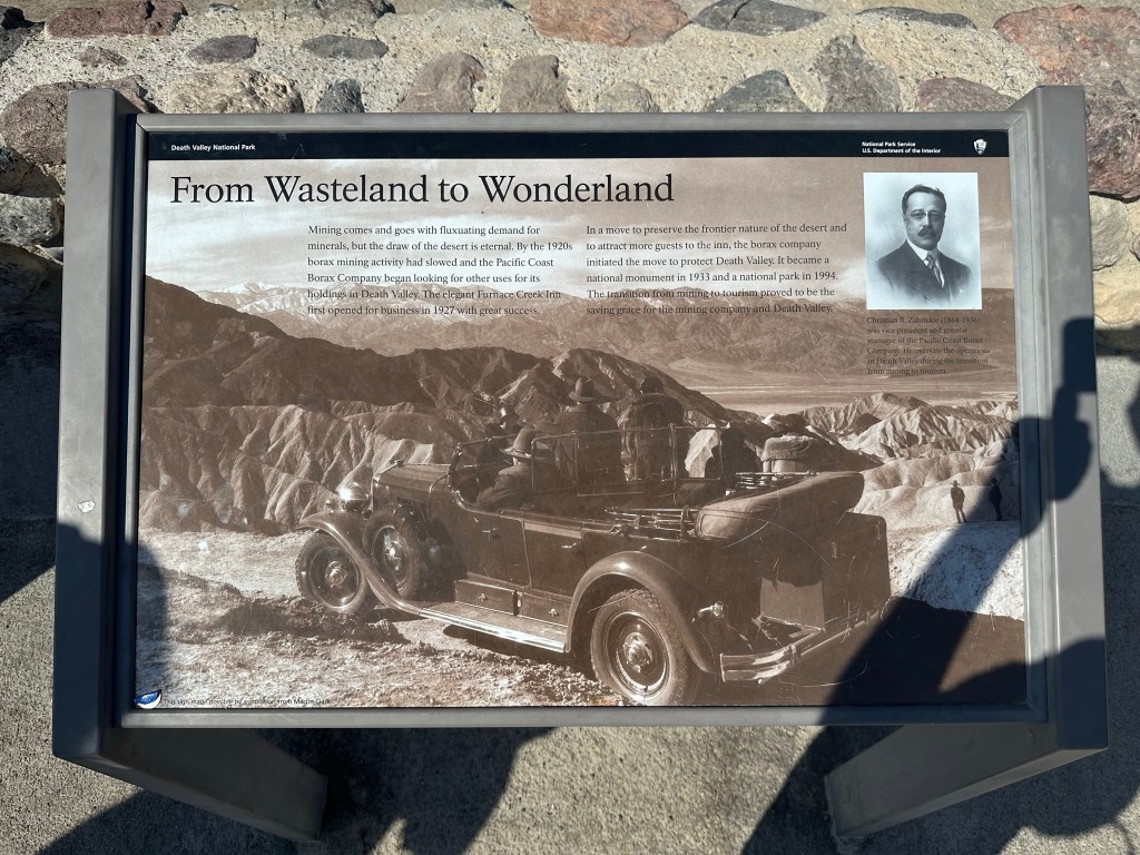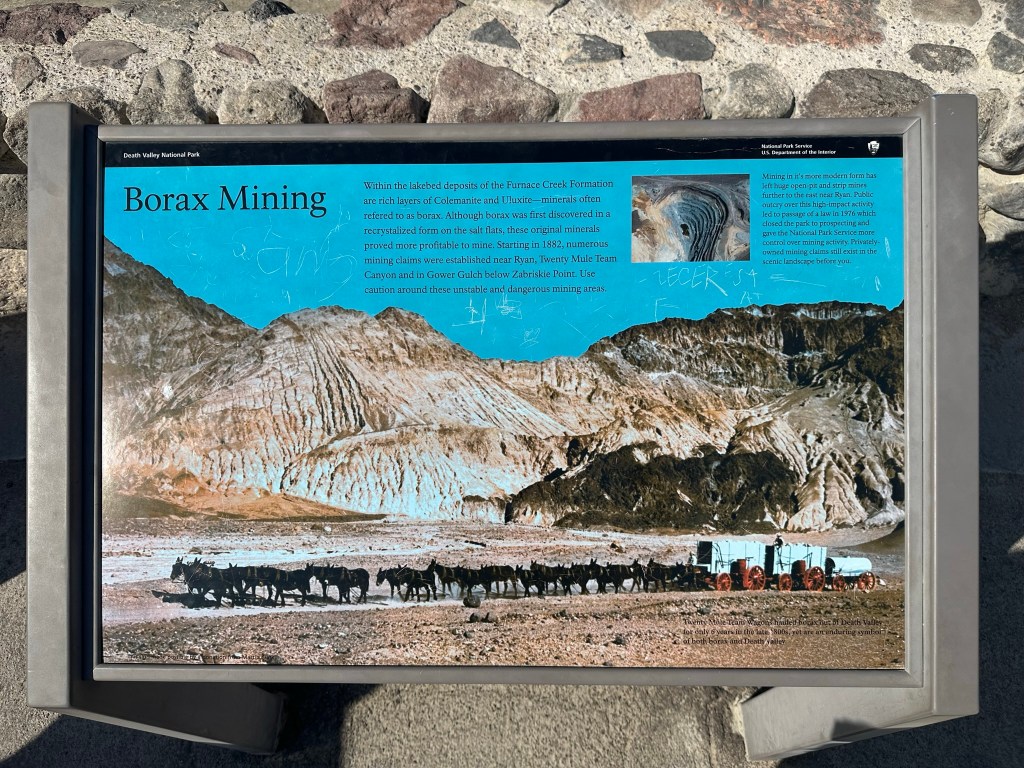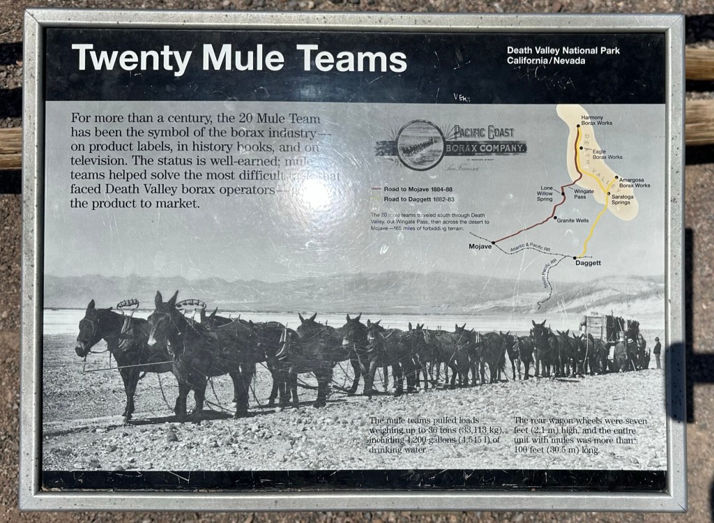 - They also had a Borax Mining Museum that had a huge outdoor component. Borax was very important to Death Valley and was called the “White Gold of the Desert” as it was the valley’s most profitable mineral. Borates, salt minerals, were deposited in the ancient lake beds that uplifted and eroded into the yellow Furnace Creek badlands. Water dissolved the borates and carried them to the Death Valley floor, where they recrystallized as borax. It was used by blacksmiths, potters, dairy farmers, housewives, meat packers and even morticians so no wonder it was called the White Gold. The indoor part was closed as they were remodeling but the outside was pretty outstanding! Fun fact the 20 Mule Team was normally only 18 mules! Hopefully this gives you a little more background on the borax mining sites you’ll see at Death Valley.