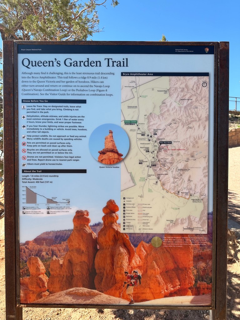 - Before we left we wanted to do a short hike or something since we weren’t able to last time. We decided to do the Navajo Loop and Queens Garden Trail. It’s a 3.3 mile trail that starts at Sunrise Point and then ends at Sunset Point. The total elevation gain is 784 feet. In other words the way down is easy while the way up is more than a little challenging!