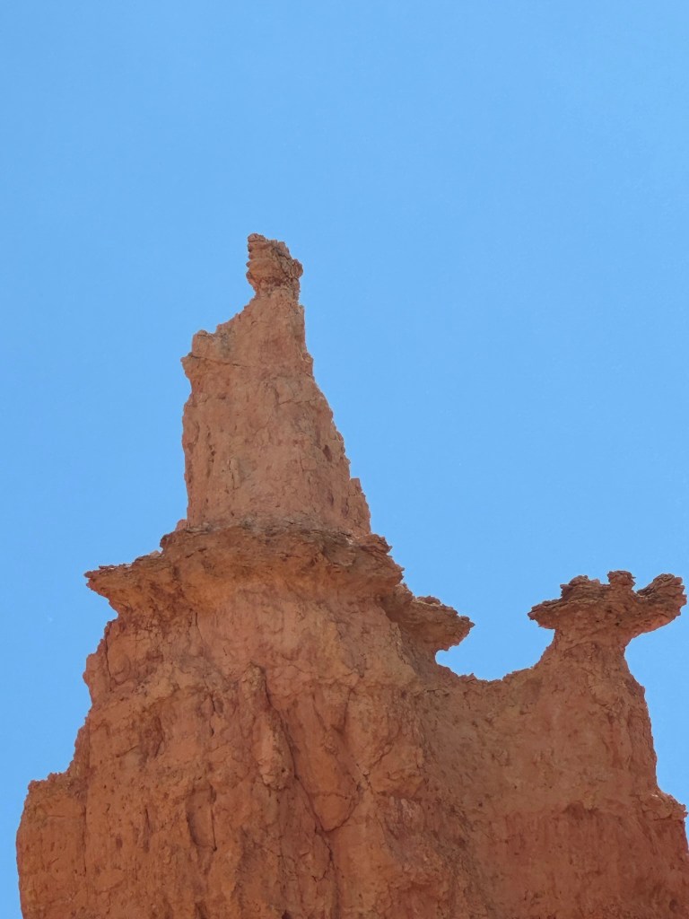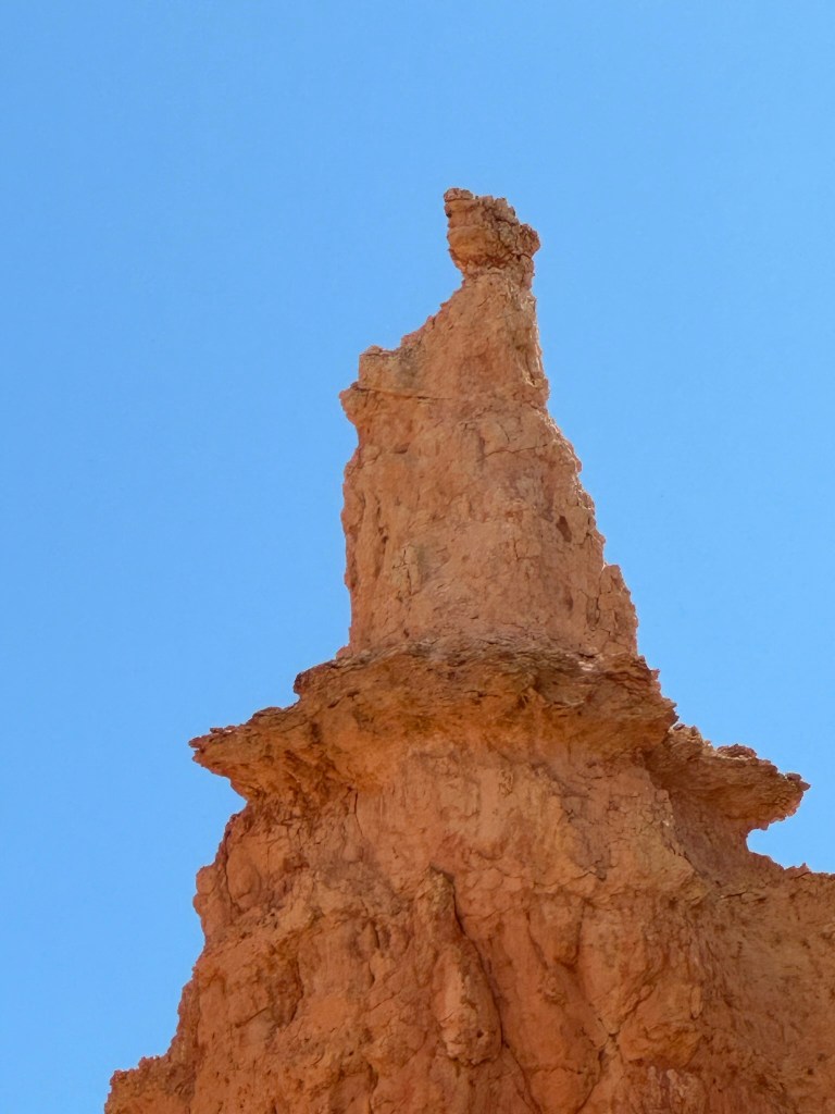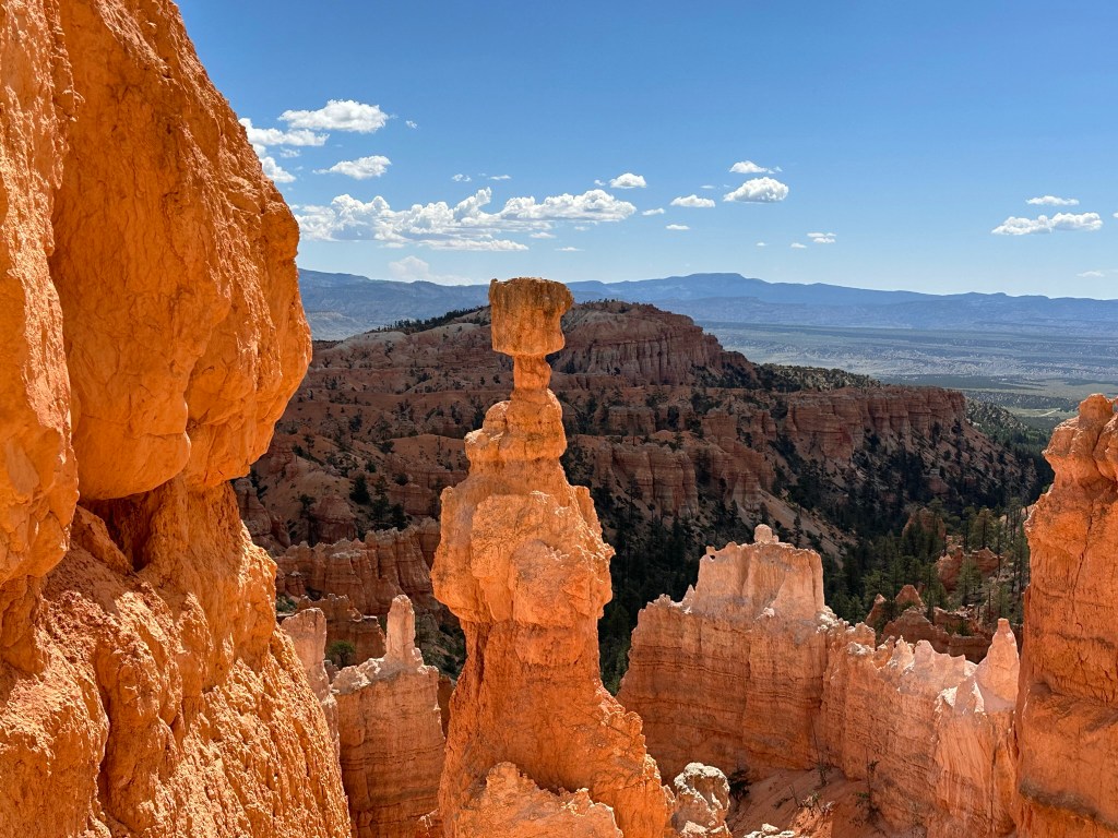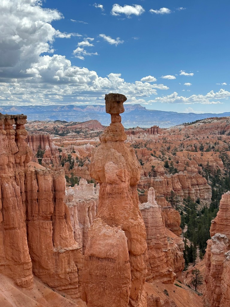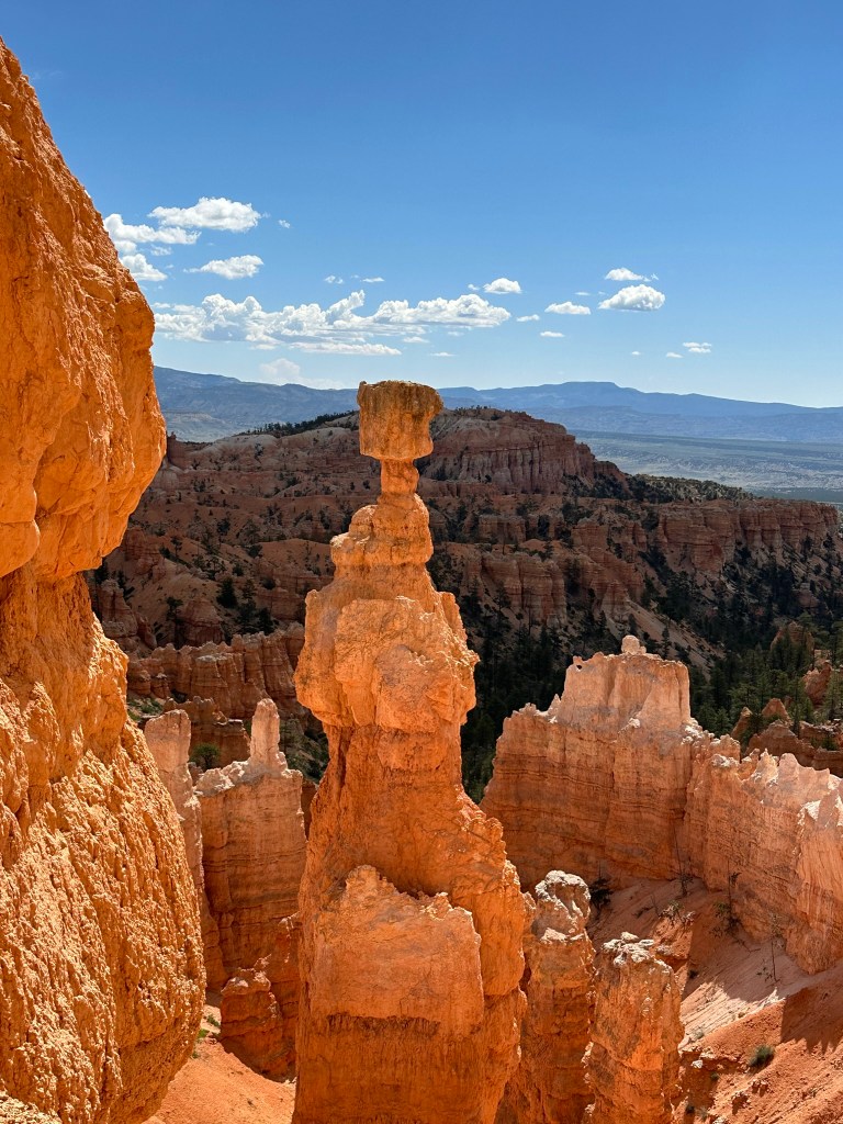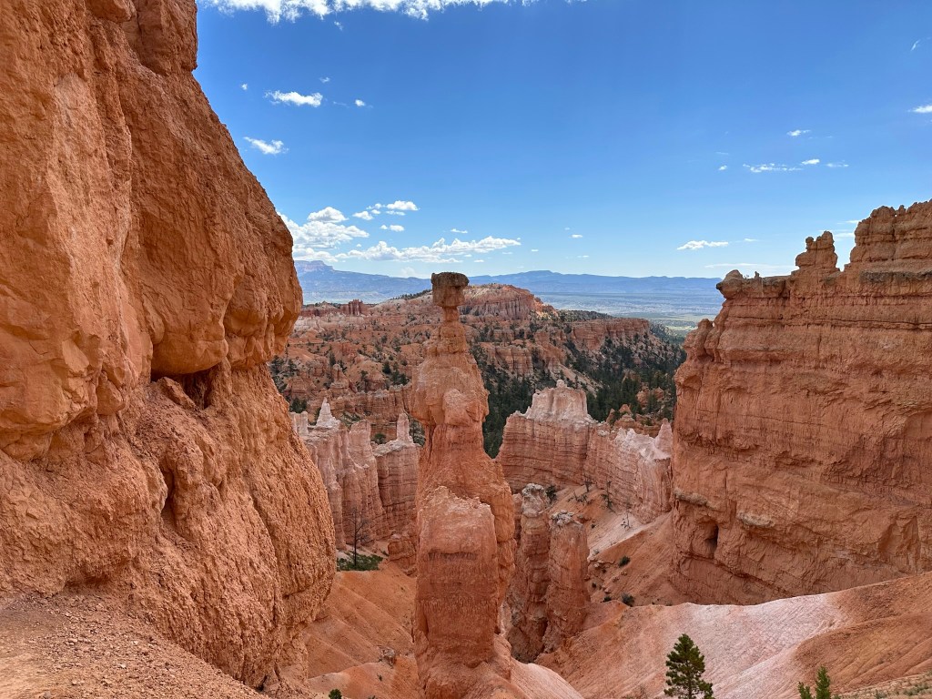 - One final thought on Bryce Canyon before I leave it all behind. Just moving a few steps will change the entire landscape perspective here. Combine that with the light changing it can make an incredible difference on the appearance of the formations on a literal minute by minute basis. Be patient on your walks! See if the sun is about to pop out behind a cloud before you leave the view behind. Not always can you make it go your way, but sometimes it works out. I know I said the same thing about Monument Valley as well. Here’s another illustration of what I mean below. This is of Thor’s Hammer from our hike. Swipe on the pictures below. They were taken just a couple steps and three minutes apart. No photo enhancement; just had the sun pop out and I moved a couple steps. Thoughts??