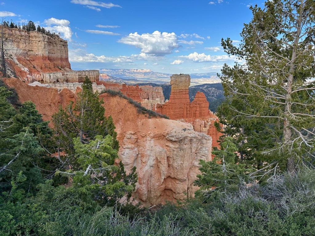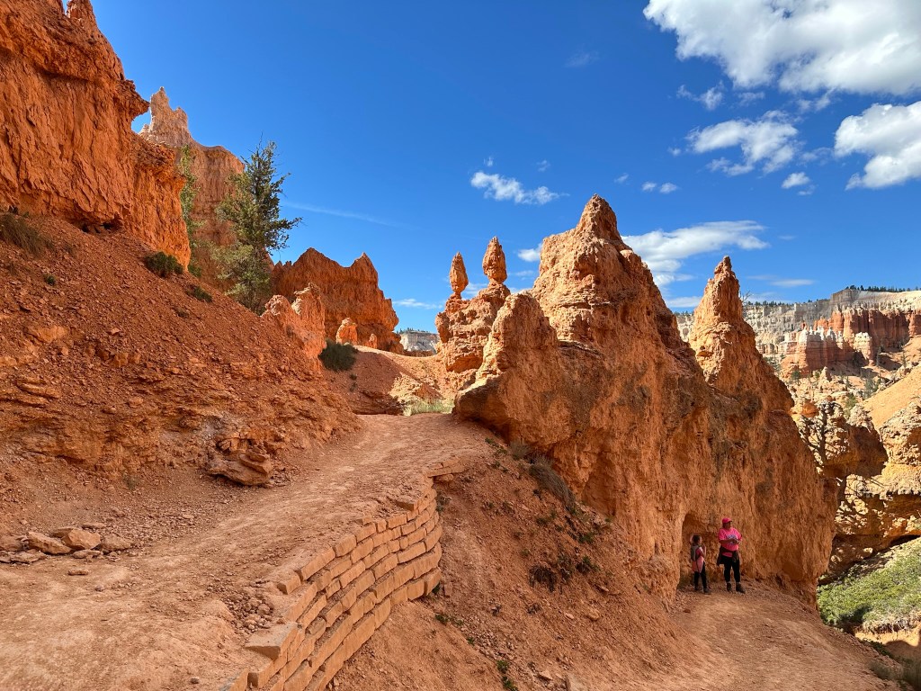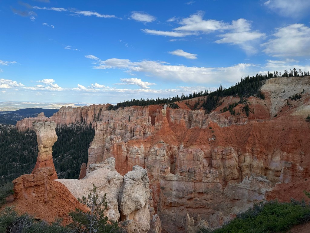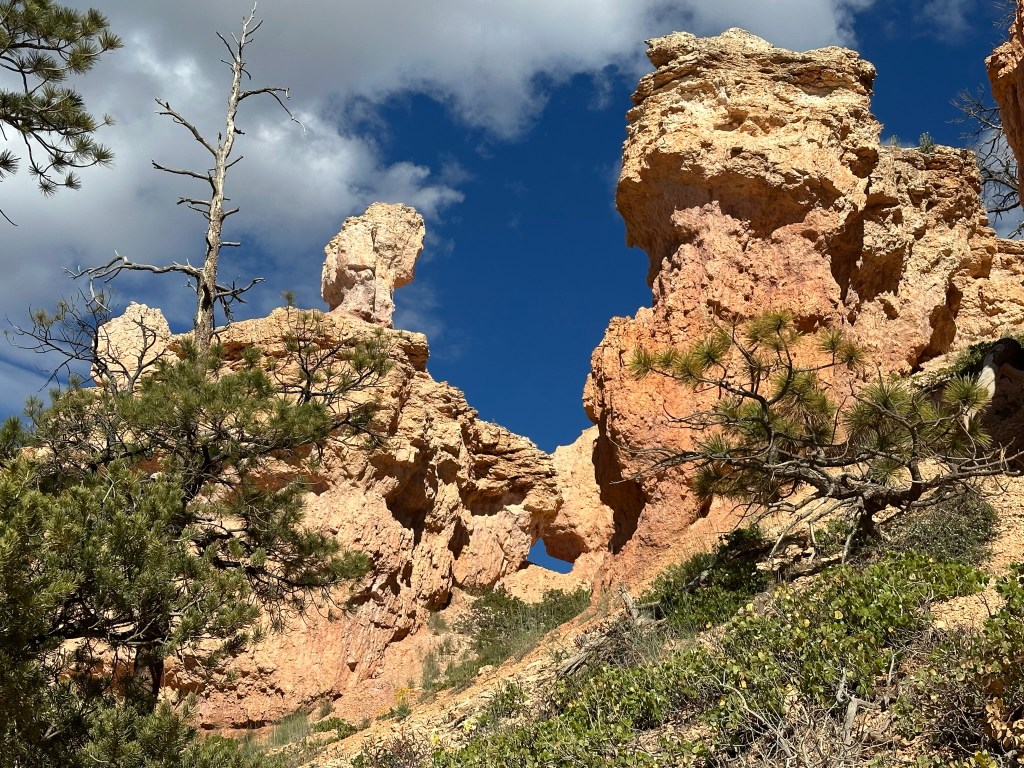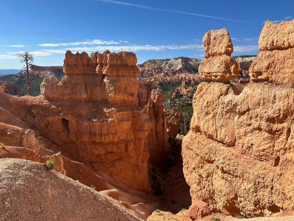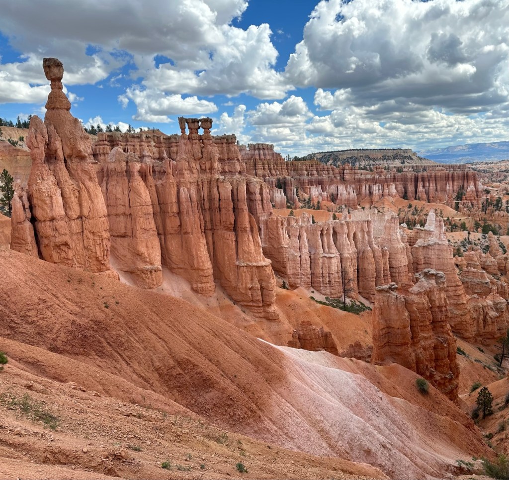 - One final thought on Bryce Canyon before I leave it all behind. Just moving a few steps will change the entire landscape perspective here. Combine that with the light changing it can make an incredible difference on the appearance of the formations on a literal minute by minute basis. Be patient on your walks! See if the sun is about to pop out behind a cloud before you leave the view behind. Not always can you make it go your way, but sometimes it works out. I know I said the same thing about Monument Valley as well. Here’s another illustration of what I mean below. This is of Thor’s Hammer from our hike. Swipe on the pictures below. They were taken just a couple steps and three minutes apart. No photo enhancement; just had the sun pop out and I moved a couple steps. Thoughts??