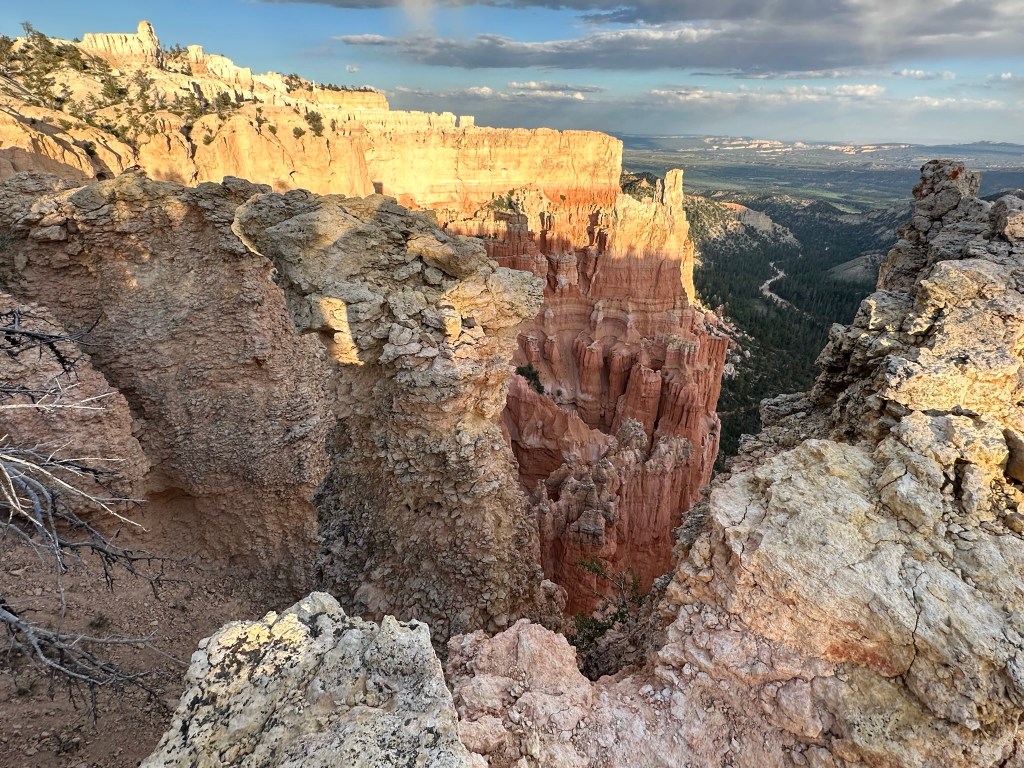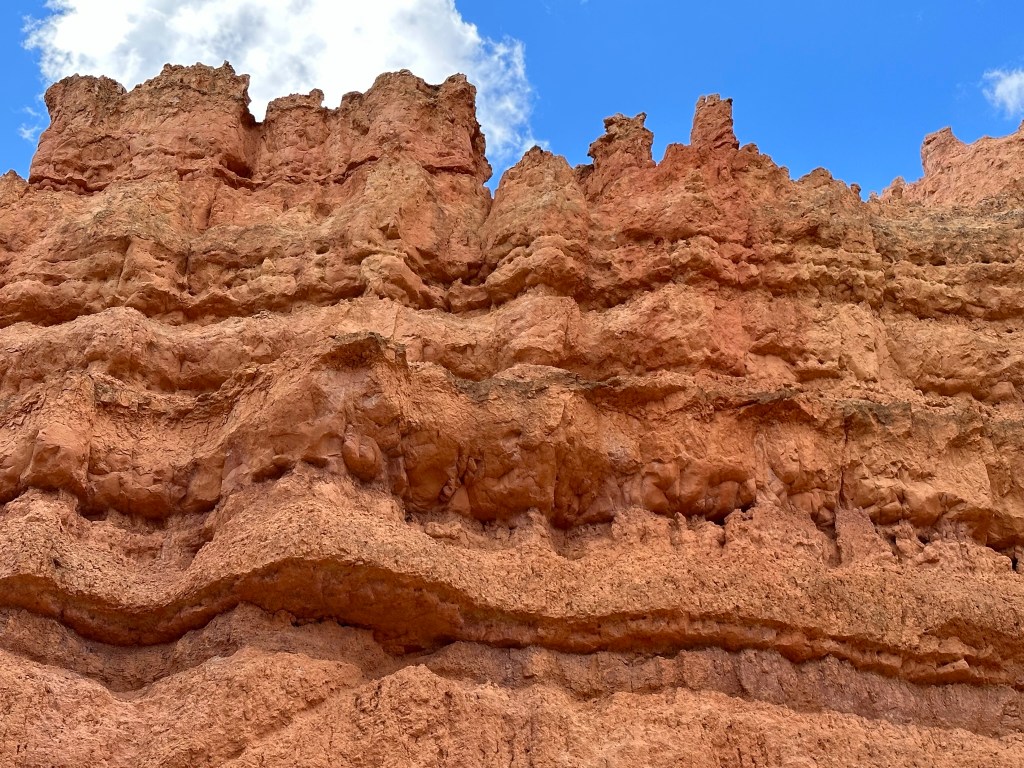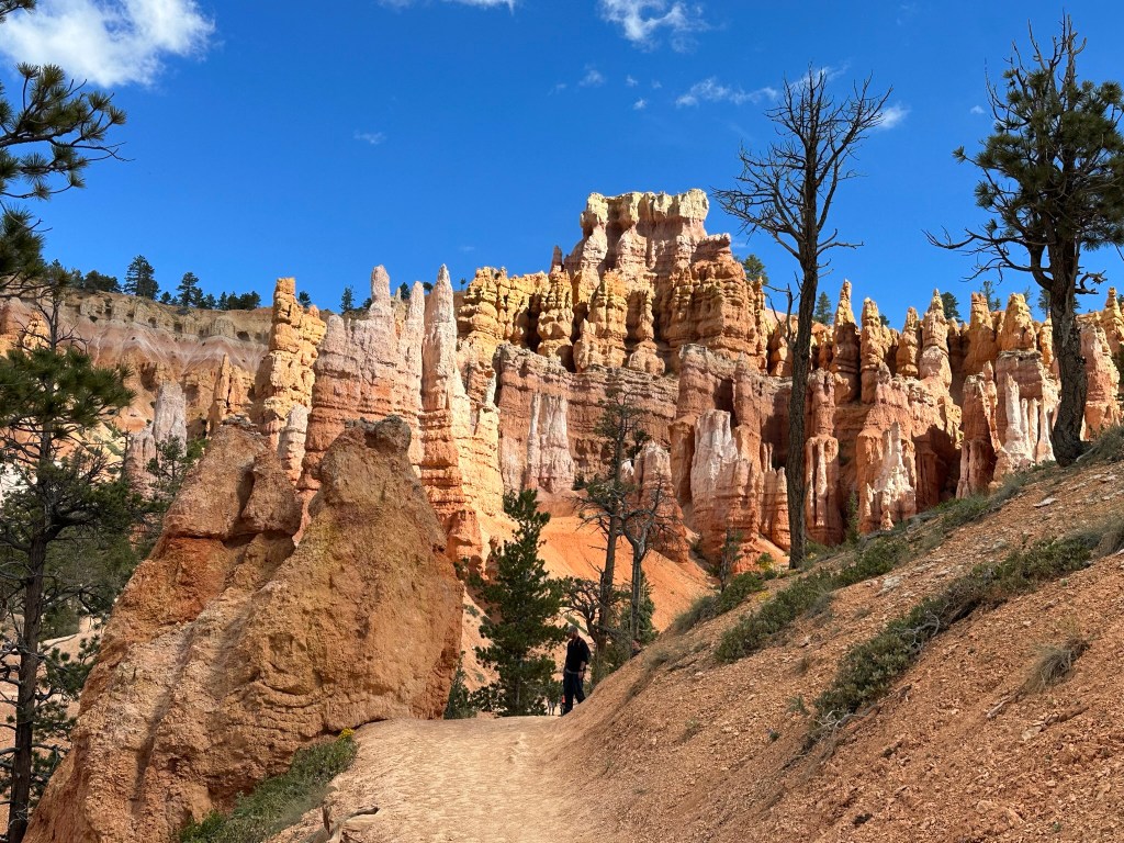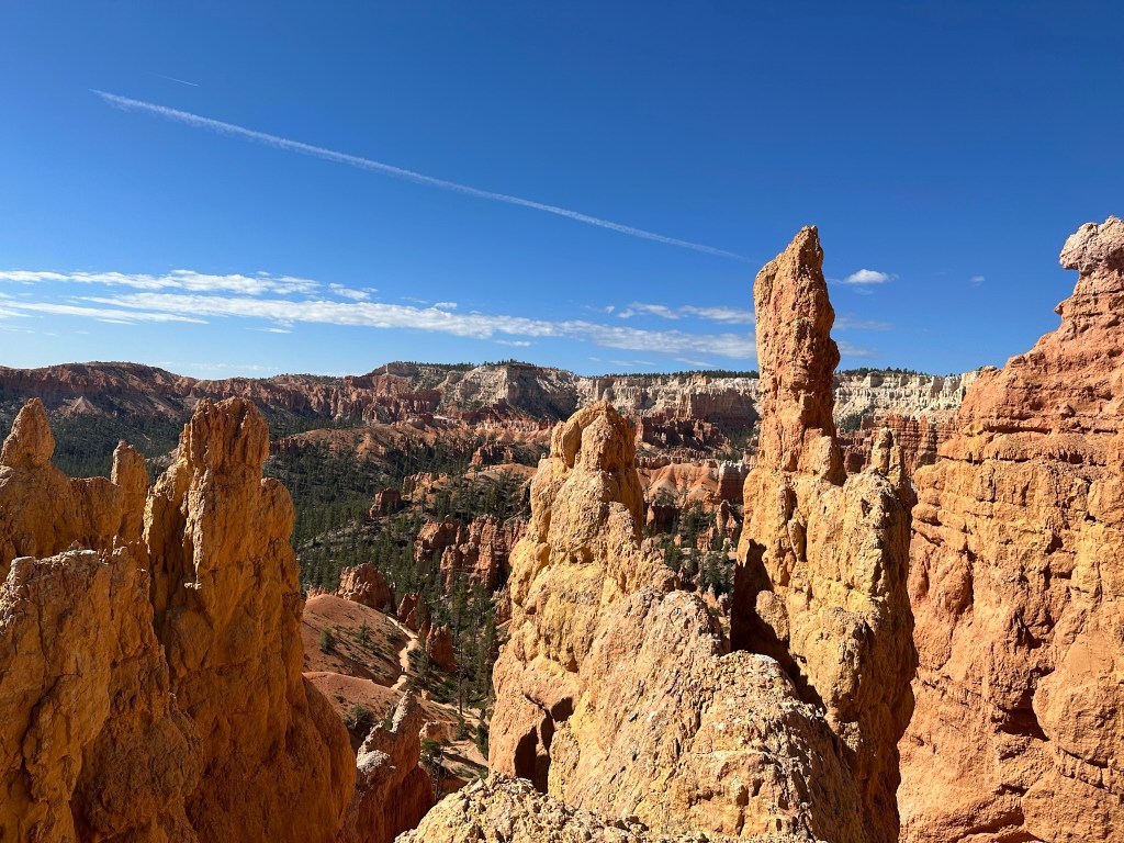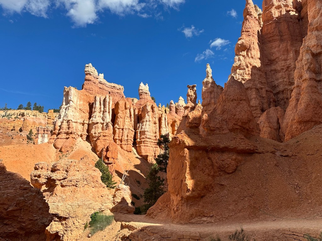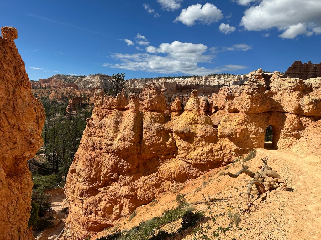 - One final thought on Bryce Canyon before I leave it all behind. Just moving a few steps will change the entire landscape perspective here. Combine that with the light changing it can make an incredible difference on the appearance of the formations on a literal minute by minute basis. Be patient on your walks! See if the sun is about to pop out behind a cloud before you leave the view behind. Not always can you make it go your way, but sometimes it works out. I know I said the same thing about Monument Valley as well. Here’s another illustration of what I mean below. This is of Thor’s Hammer from our hike. Swipe on the pictures below. They were taken just a couple steps and three minutes apart. No photo enhancement; just had the sun pop out and I moved a couple steps. Thoughts??
