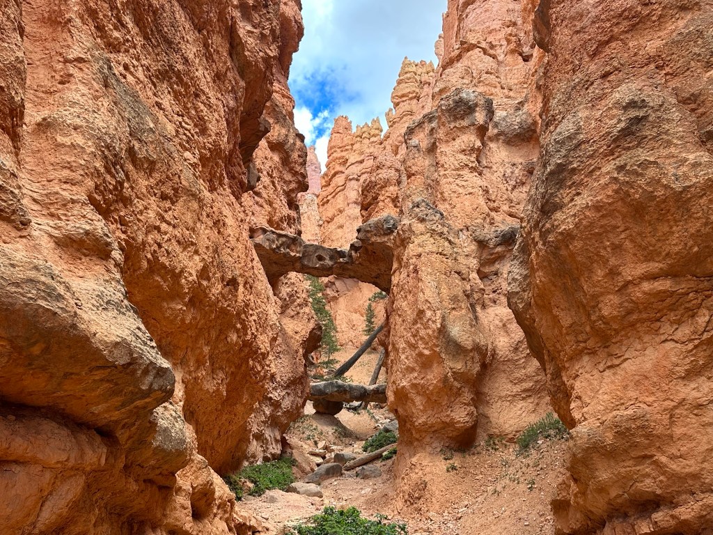 - Still marveling at the landscape we stopped just a few miles outside of Bryce to hike to Mossy Cave just off the road. It’s only a 0.4 mile hike and looked like fun. We started on the hike and I started feeling raindrops so I wussed out and headed back to the vehicle. Good decision as it turns out it poured down rain just a few minutes later as we were safe and dry in the vehicle cruising on down the road.