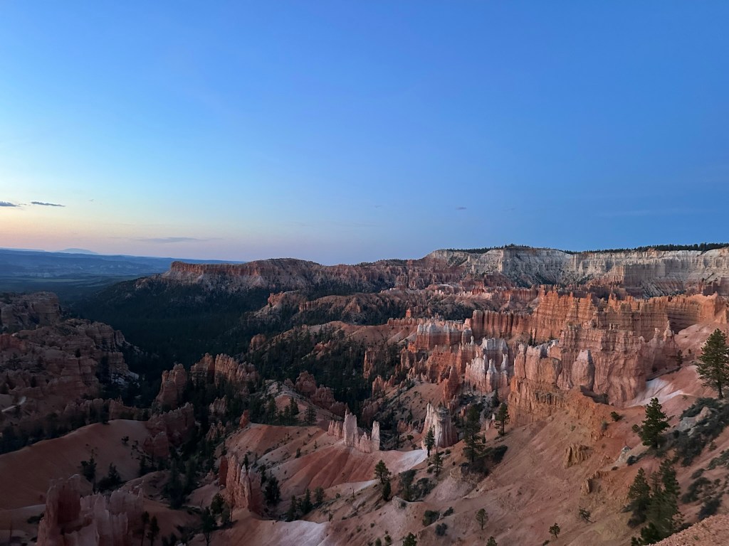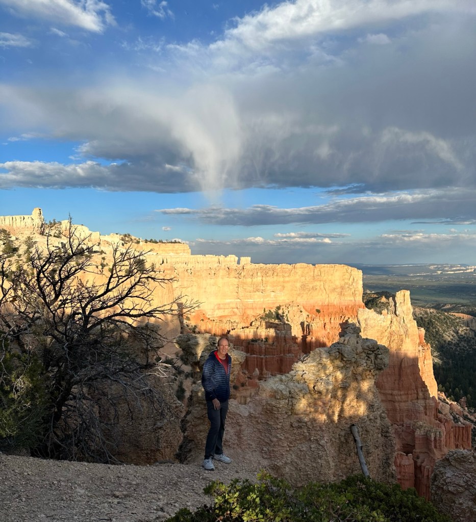 - Leaving Inspiration Point we bypassed Sunset Point (elevation 8,000 feet if you’re keeping track) to get back to the lodge for a quick stop at Phanta to grab some charcuterie makings for a fast snack in the room and then out to the Rim just outside our cabin to watch the sunset play over the landscape. Again, our cabin was right in-between Sunset and Sunrise Point (elevation 8,100 feet). Sunset and Sunrise Point are about a mile apart so we thought it would be a good spot to “split the difference” and enjoy the view without the crowds. For reference it was 8:36pm.