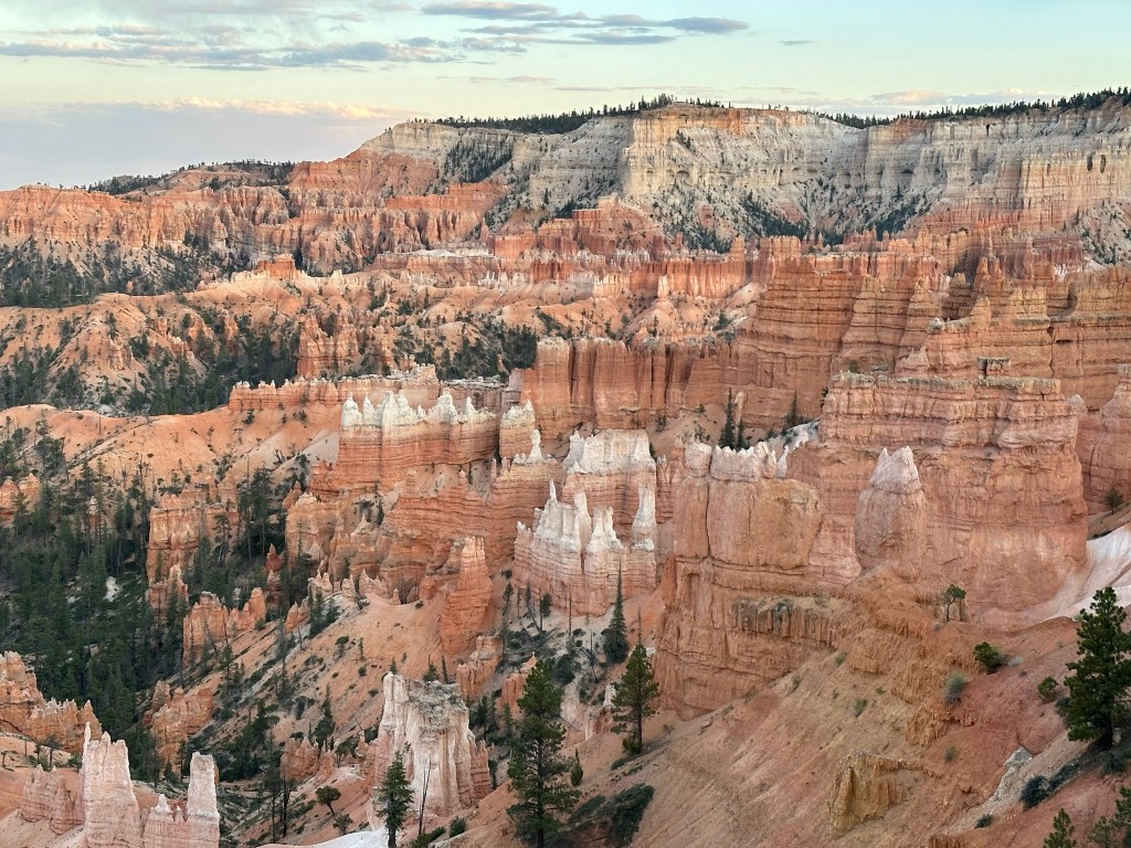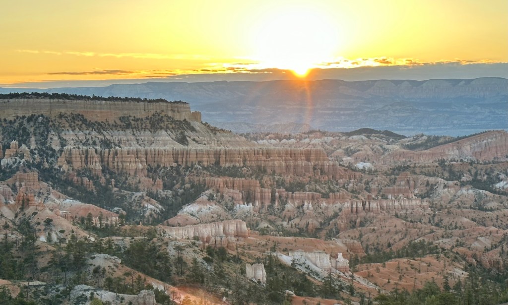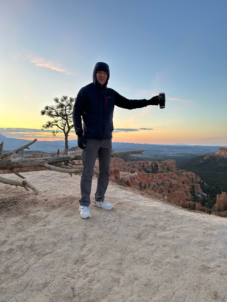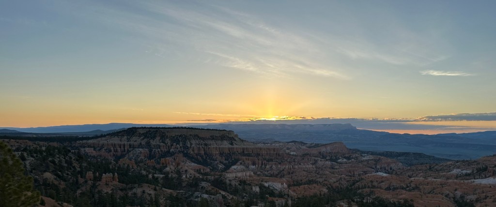 - Quick walk to Sunrise Point and took pictures of the sunrise. The sun ended up being a little late since it was cloudy however it too made an appearance for us. There were quite a few people at Sunrise Point but no one was jockeying for position or anything. It was really pleasant except for the 43 degree cold weather. Some people showed up in shorts.. We were not those people!