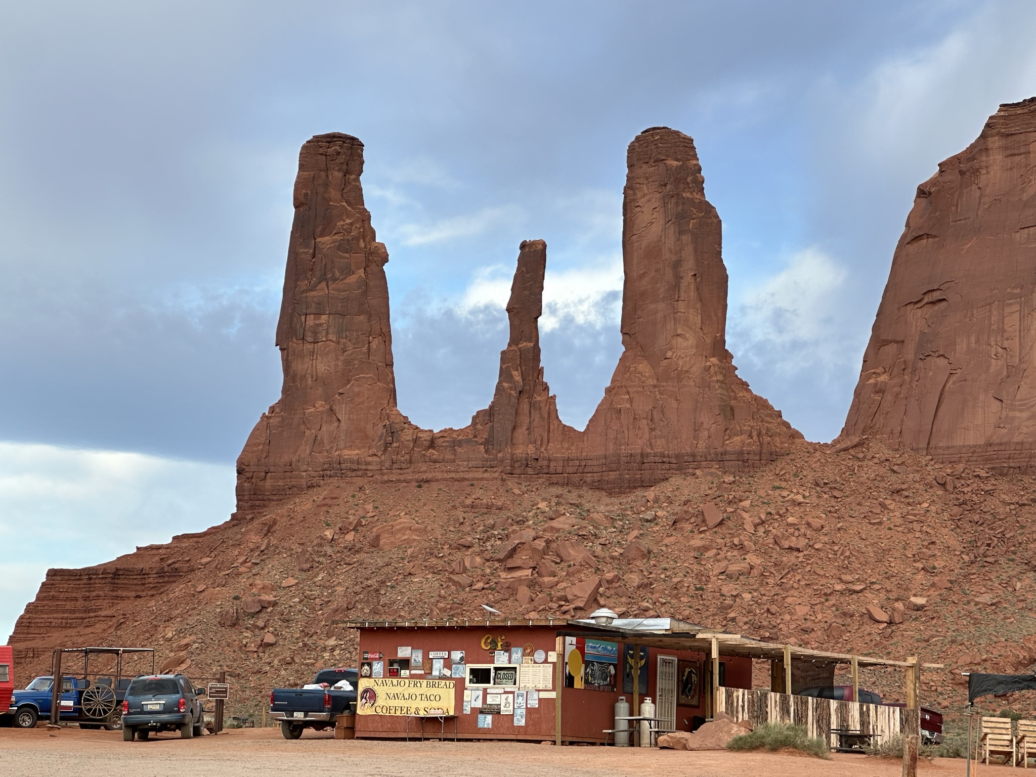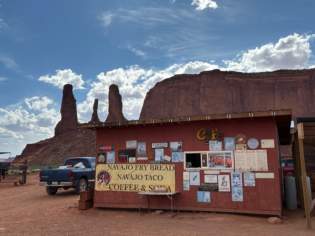 - Pro tip: We did a quick stop off in the Valley to get some dinner for the evening at Linda’s Café which is right by John Ford Point. The food was solid (Navajo burger and green chili taco) but the fried bread was great! We had her put garlic salt and butter on it and we gobbled it up pretty quickly. Much more reasonably priced than the restaurant at the Visitor Center and it’s the same food selection and you cannot beat the view! What a place to sit and eat your food with Three Sisters and John Ford Point being right behind and beside you! Having said that Three Sisters was really hard to get a good shot of in the evening light.