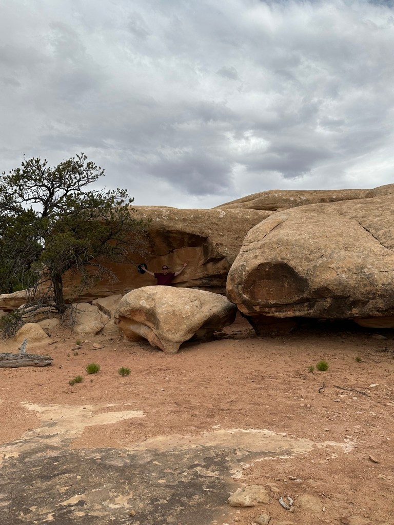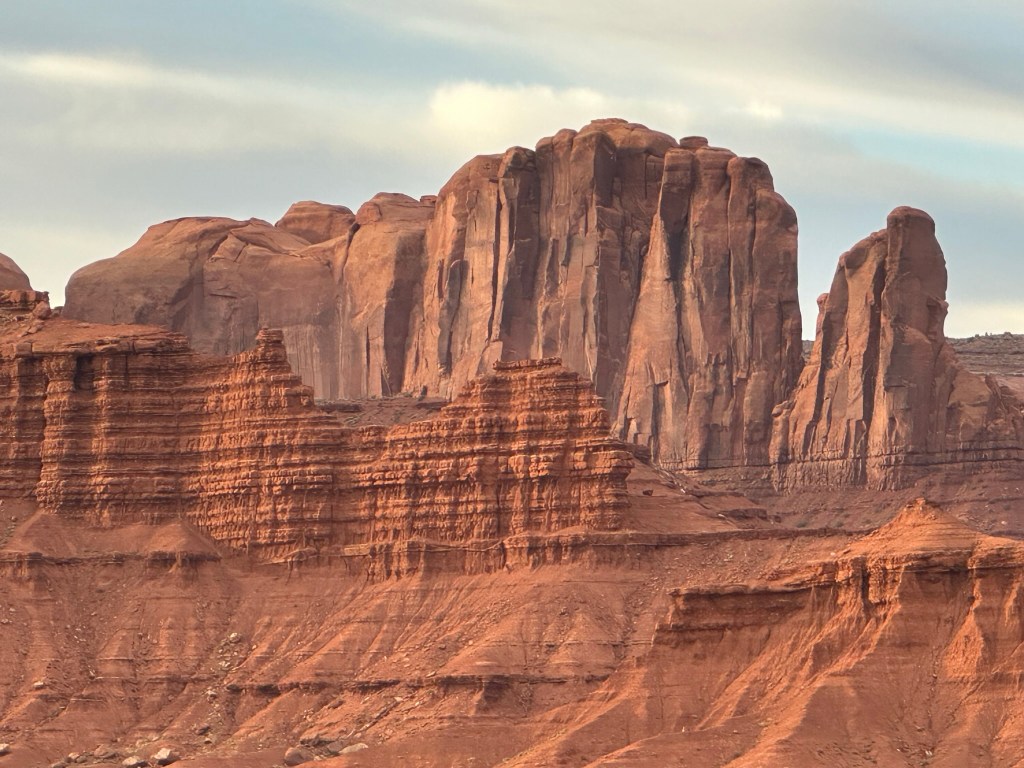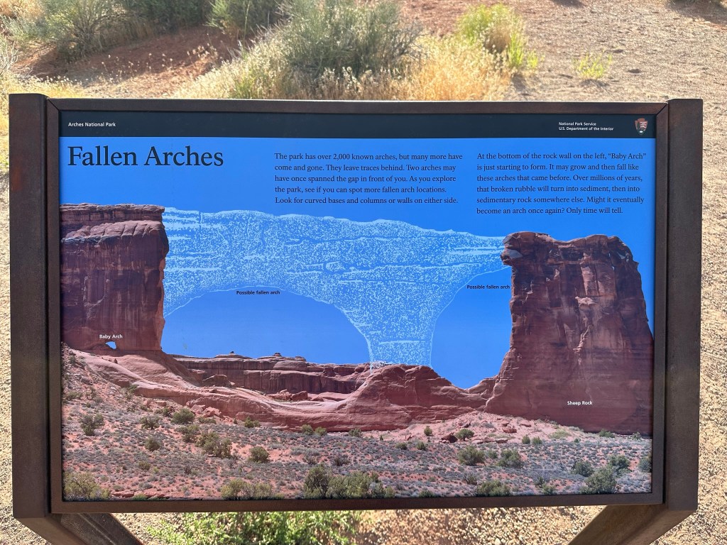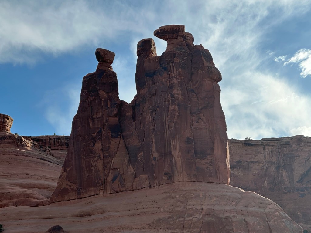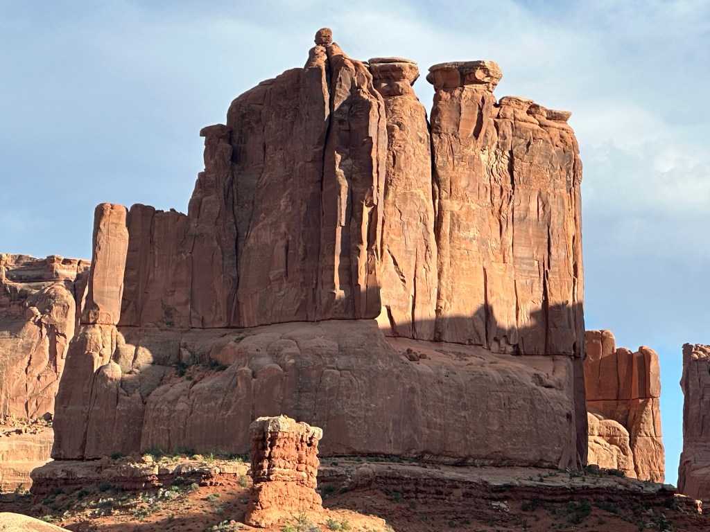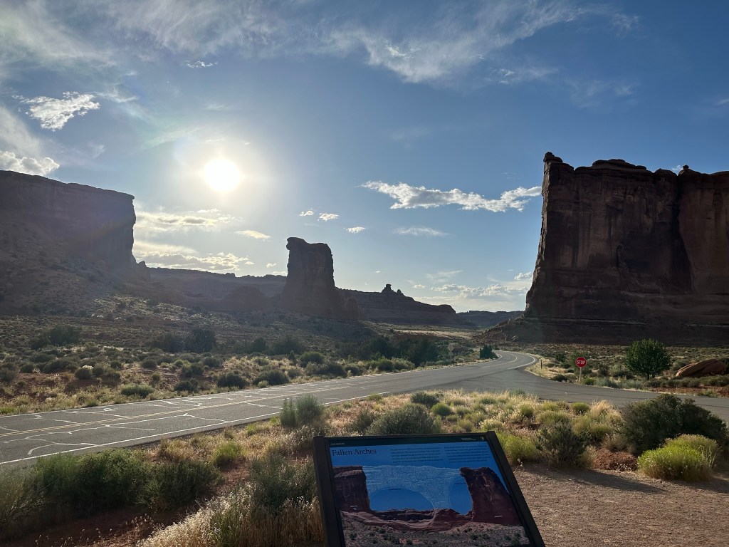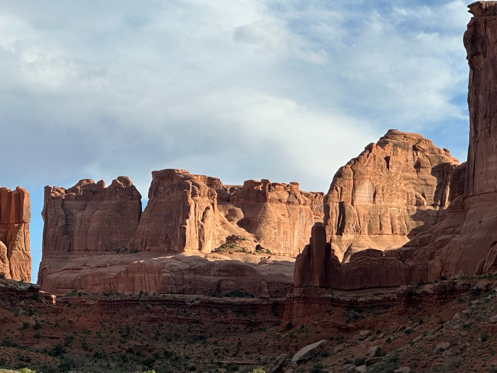 - Refreshed from eating we drove on out to Arches National Park to do a drive through and a short hike. Probably about 7pm by now so some of the light was good and some was not. Regardless we had a great time and the views were wonderful as always. Bonus for us was there wasn’t a lot of people in the park at that time and most of them that were there were busy hiking to Delicate Arch or some other hike. Just weren’t many people driving around. We didn’t really take many pictures since the light wasn’t cooperating very well. If you want to see extensive pictures of Arches see my blog post “Western Ho” from 2022 when Olivia and I went there. Lots of pictures and trail information there and frankly no need to duplicate here. Just because I love Arches though I’ll stick a couple in here.