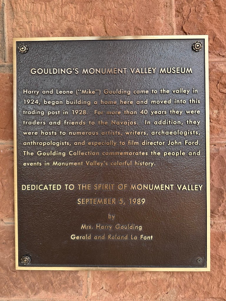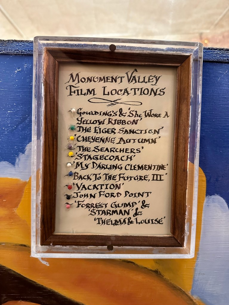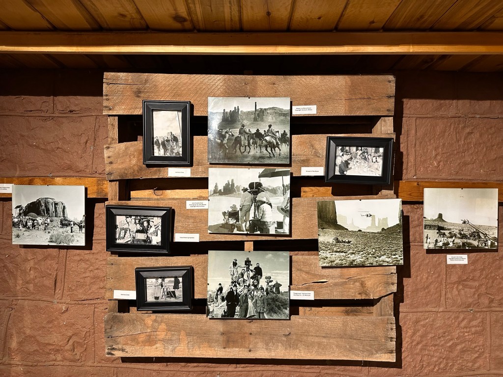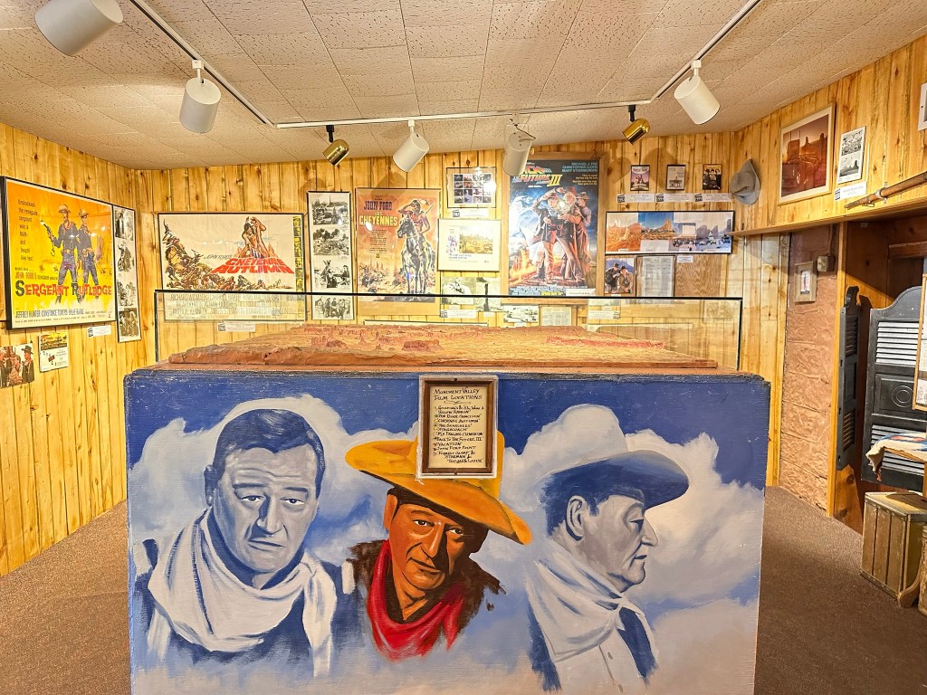 - Goulding’s Museum Stagecoach was our first stop and we got there about 9:20am. It’s about 4 miles away just outside entrance to the park. Goulding’s is a great spot to visit. The Stagecoach Museum was very cool and there is a lot of John Wayne history there, so now I have to watch, “She Wore a Yellow Ribbon” as well as John Ford’s Calvary Trilogy. Several other movies were filmed in Monument Valley and they have a tribute to those also. Fun fact; they weren’t all westerns either. Ever hear of Back to the Future? Yep, part of that was filmed here! They also have a lodge and campground. I think next time if I can stay a couple days I’d do the Rim Cabin in the park like I did this time however if nothing was available or only a one day stay I’d try staying at Goulding’s. The view of the Valley is spectacular! Here are some pictures from around and inside the museum. Lot’s of it is dedicated to the movies because the movie industry revived the area economically plus who doesn’t love the Duke?!