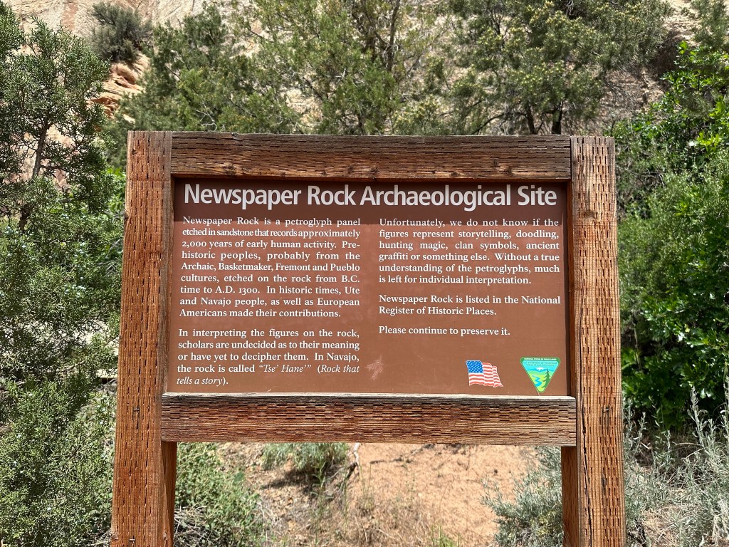 - One very interesting stop on the way in was Newspaper Rock. It’s a huge rock that has petroglyphs dating back from the B.C. times to A.D. 1300. Make sure you stop and see it. We still don’t know what he meaning is for sure or even been able to decipher some of them. It’s amazing to think of the communication that went on here and that it has survived so well for so long! It looks like there are some camping grounds here (Indian Creek Camping) however we didn’t see them. Make sure to click on the pictures to expand them so you can get a good look at them and the history. It’s pretty amazing that it’s survived so long out in the open. If you’re keeping track of the time it’s about 2:15pm right now so we’ve been moving pretty fast….to fast actually with more to go. Hard to appreciate things to the fullest when going through them this quickly.