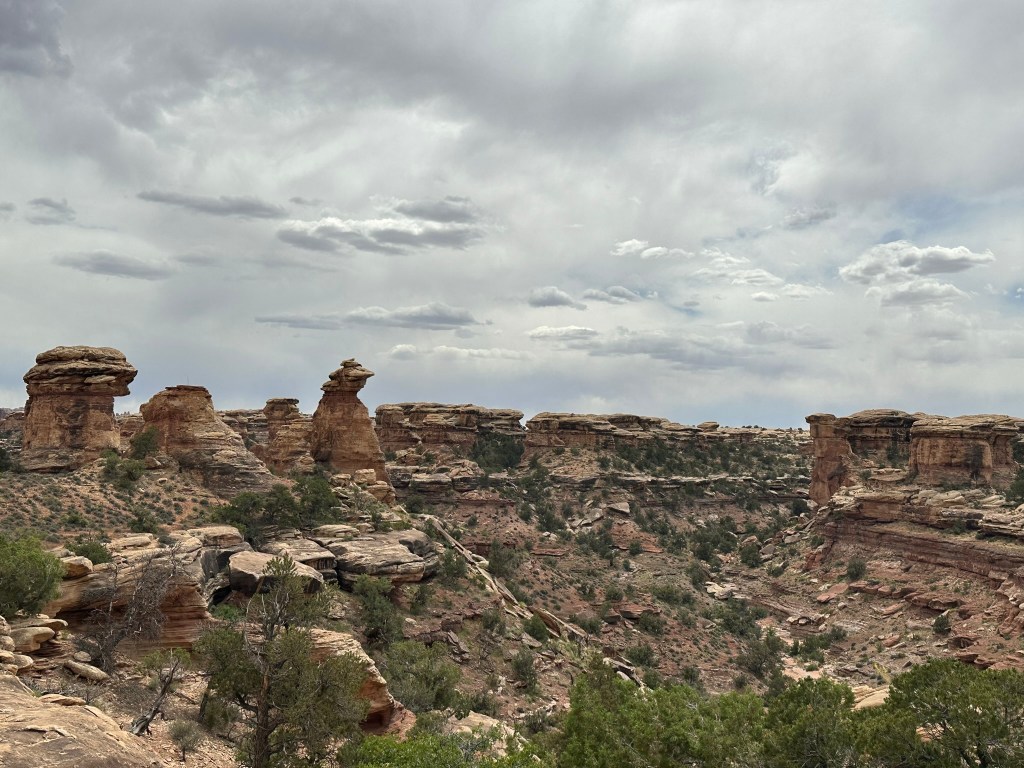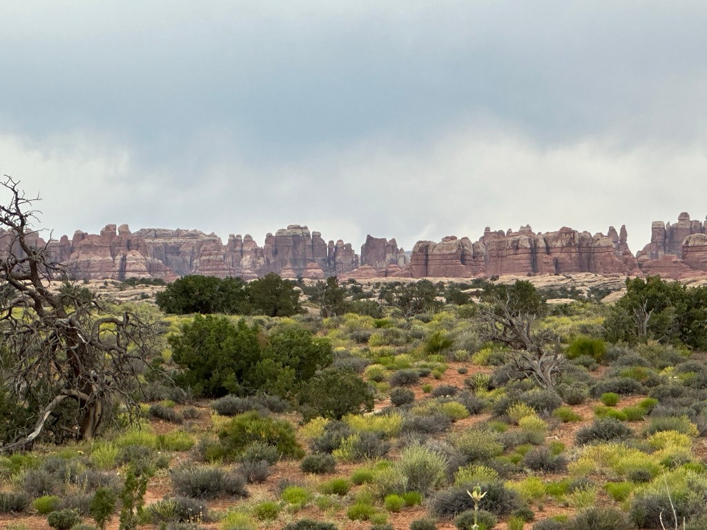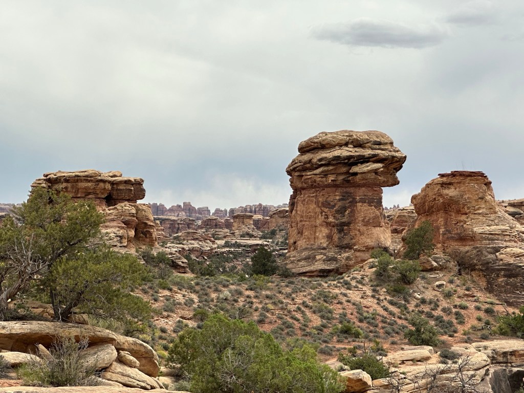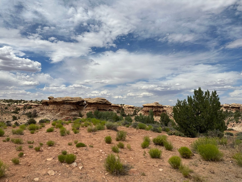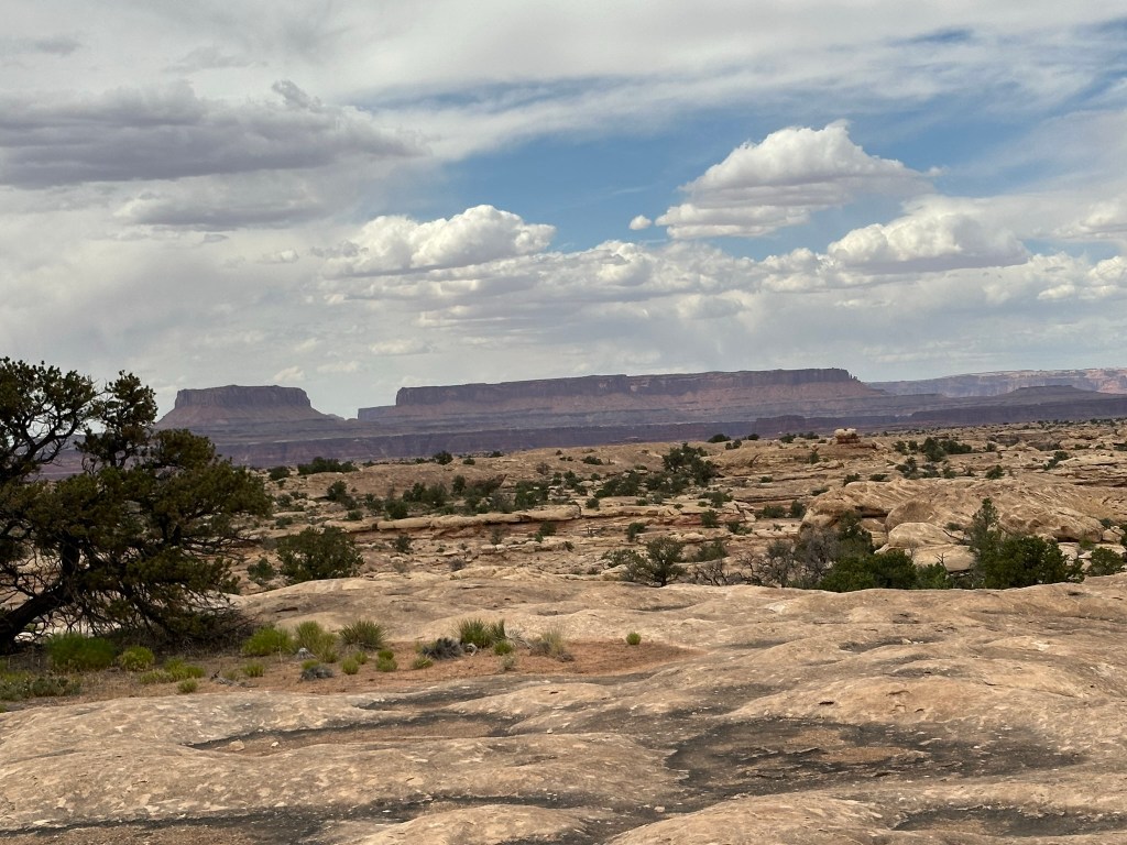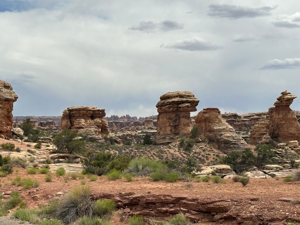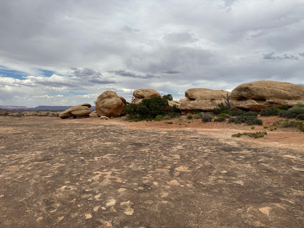 - We did take time to do a quick hike on Pothole Point Trail. The trail is called this because of all the depressions in the rock along the trail. When it rains water fills them up and eggs hatch or dormant critters emerge. Wet or dry don’t walk on them as it will disrupt the fragile ecosystem. I put the hike pictures below so you can see how it all changes as you walk around the loop trail. It’s a very stunning walk filled with many different types of views of the ever changing landscape. It’s pretty captivating. As a bonus you can also see the Needles from this hike and if you’re lucky some beautiful cactus blooming at the very beginning (or end depending how you look at it) of the trail.