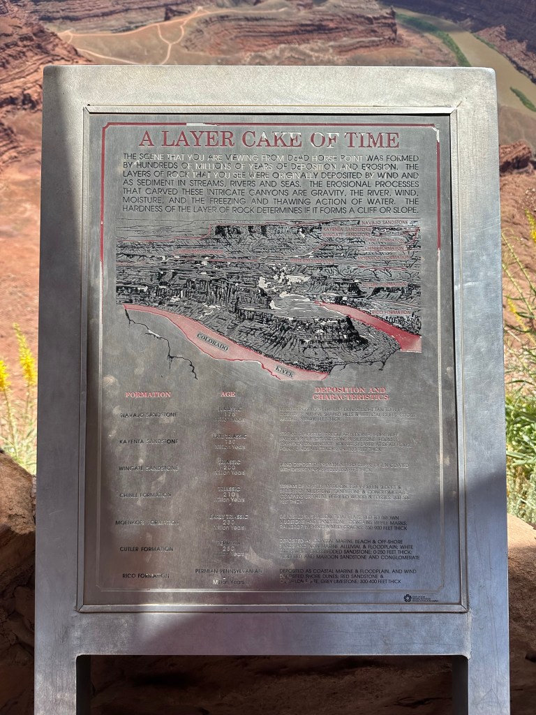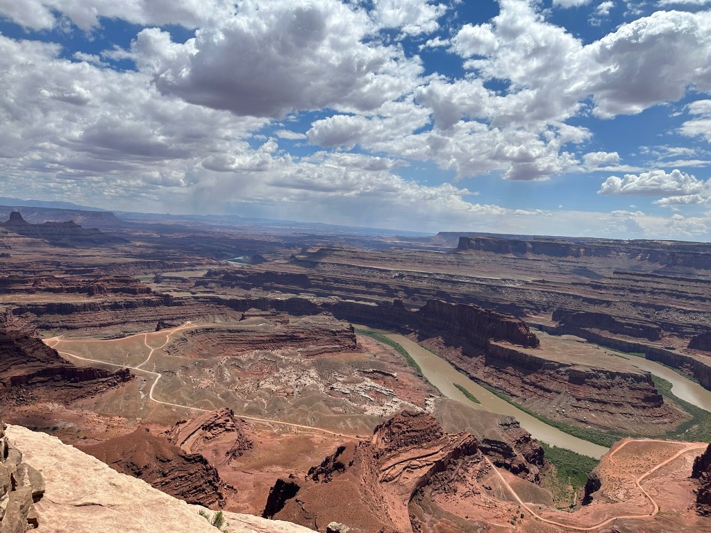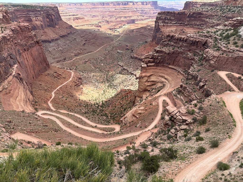 - We drove on up to Dead Horse Point and took a few more pictures before we left. We only did a short Rim Trail hike however there are more hikes available for you to get your walking legs on. I have to say I was a little envious when I was taking pictures of the vehicles driving the road at the bottom of the canyon. It’s a longer time period than we had so not this time however I’m hoping next time I’ll be able to reserve a spot to camp down there and drive it. It looks like this is the Shafer Trail so I need to double check it but looks like it goes from Canyonlands over to here.