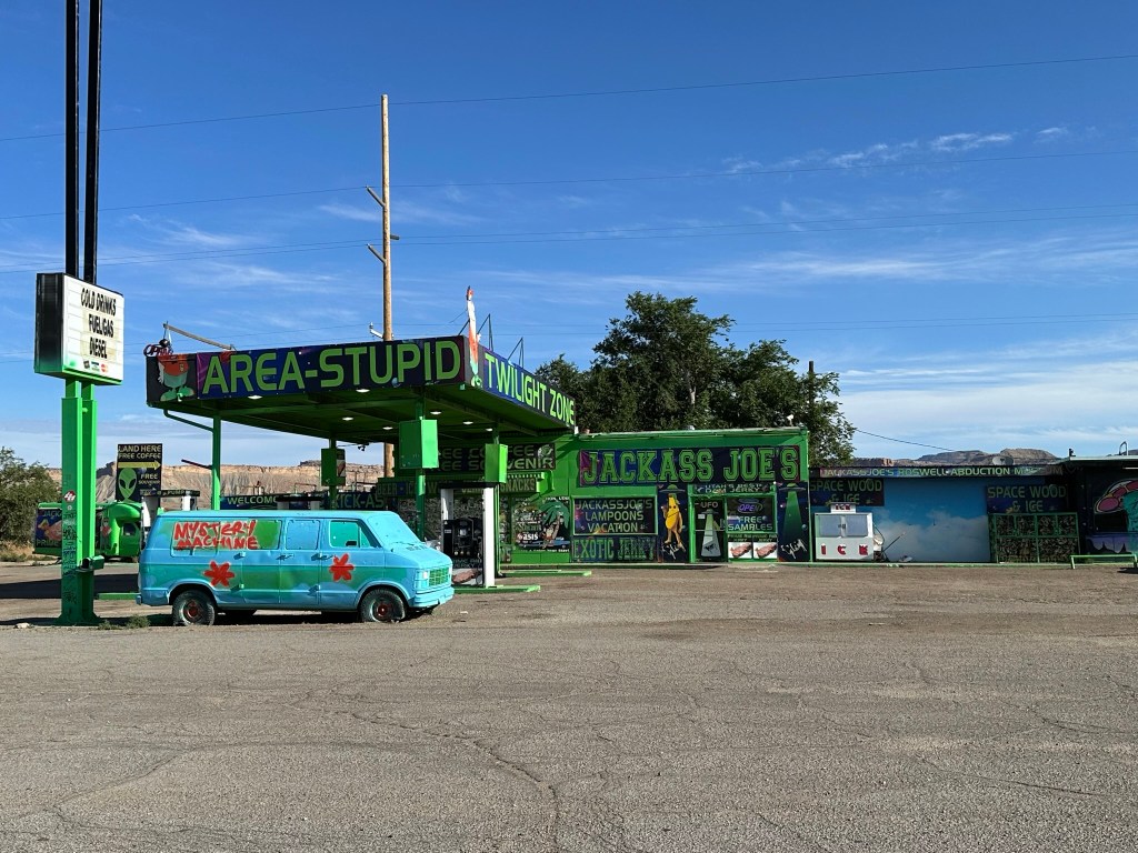 - First stop of the day was an unexpected one at Jackass Joe’s on the corner of I-70 and Highway 191. This is quite the stop as it’s a Roswell lover’s dream store. I didn’t take any pictures of the inside of the store however it’s pretty neat as they sell Unicorn Poop and other assorted varieties as well as jerky and much more. Make sure to use the bathroom as the commode is gold plated. When I talked to the guy running the register he remarked about how “out there the owner is”. Sounds like my kind of guy! Make sure to stop and patronize this place!