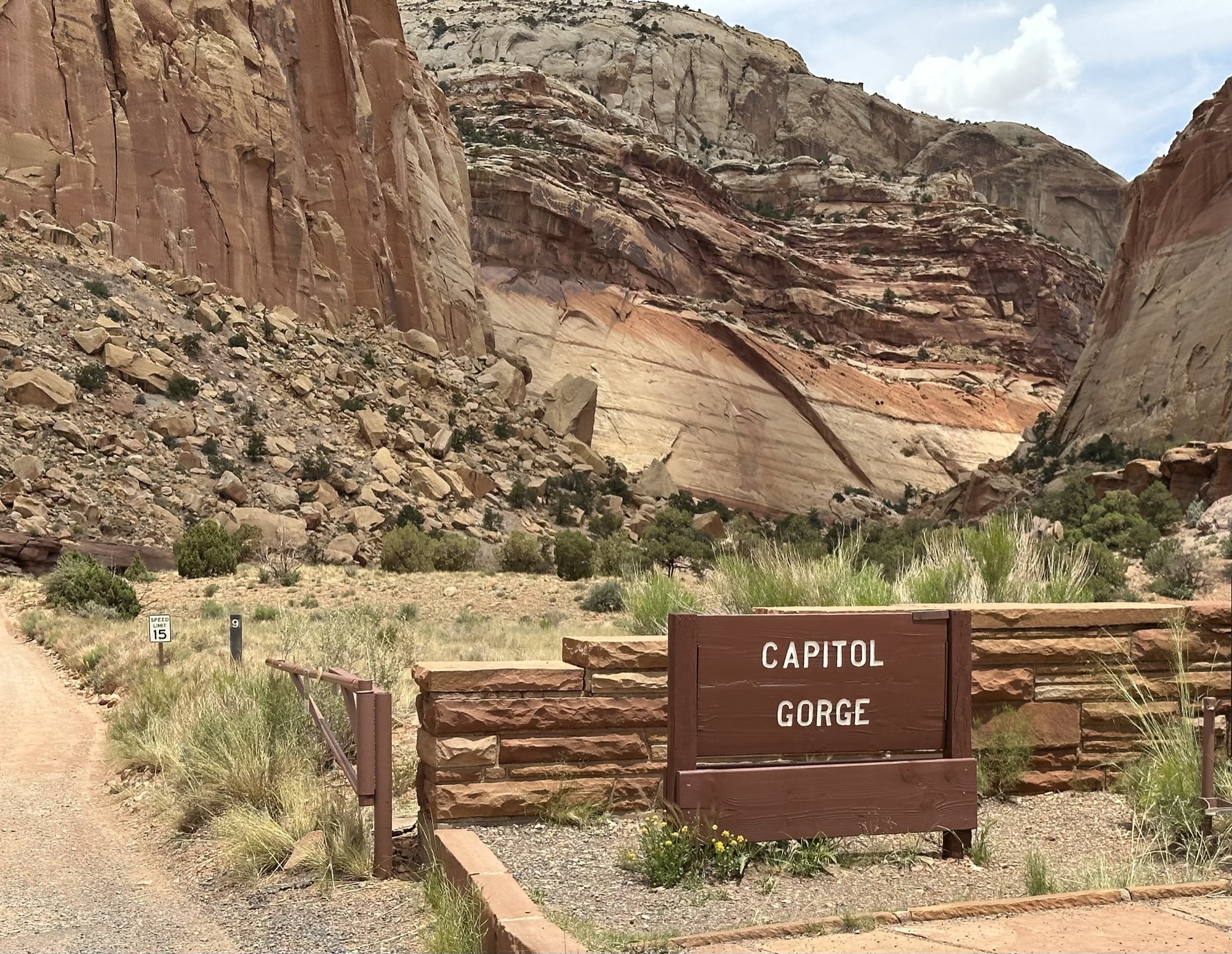 - Once you get to the end of the paved part of the scenic drive it will let you go on to the unpaved portion. There are restrooms here also if you need to use them before you head on into Capitol Gorge.