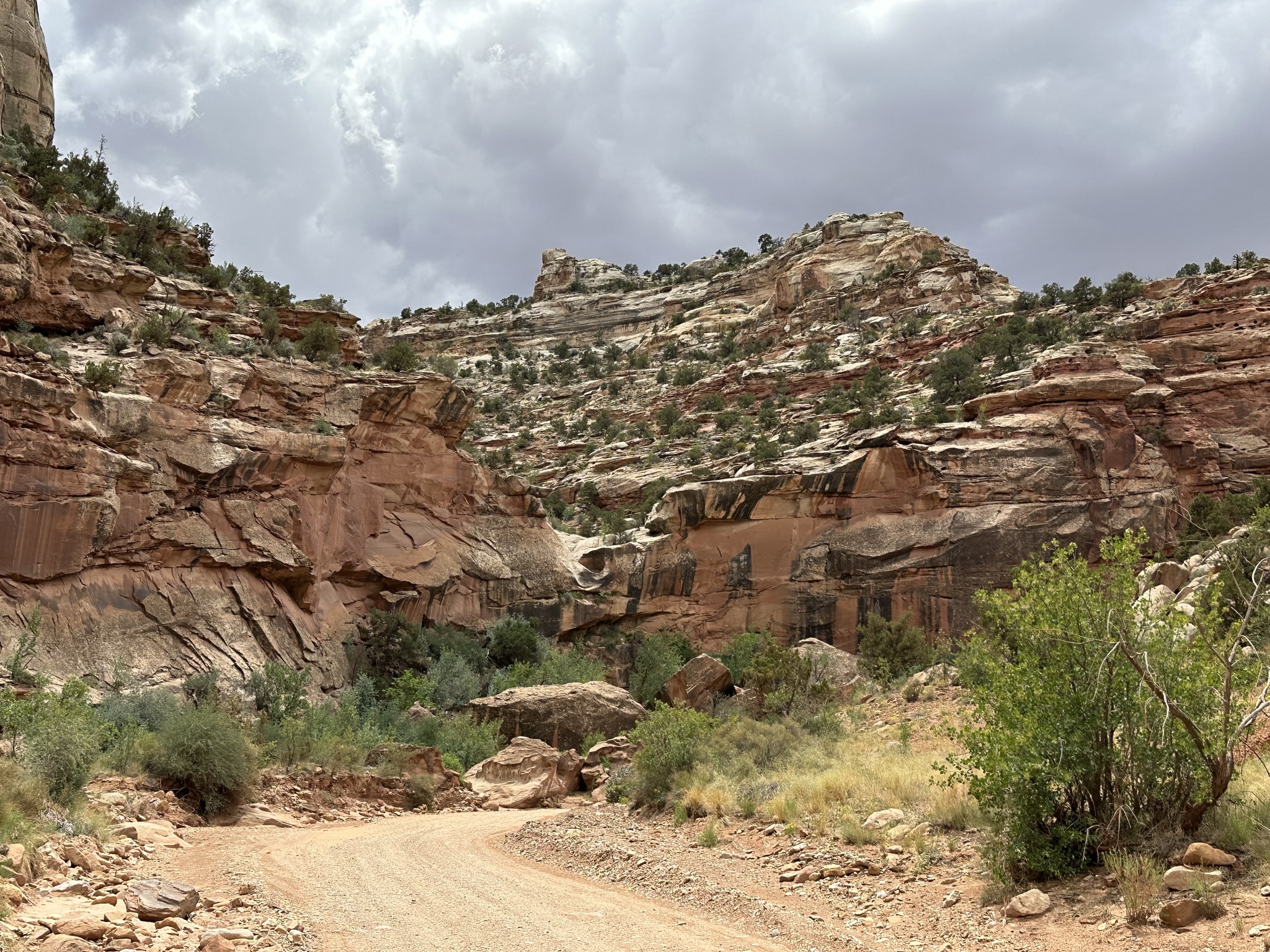- Driving some more we made it to Capitol Reef National Park. This is a pretty cool place that we didn’t do a lot of justice to as we didn’t stay that long. We drove the scenic drive and Capitol Gorge however there were a lot of people around and it was pretty crowded. In addition there were black clouds hanging in the sky and you don’t want to get caught in the low spots or canyons there when it rains due to the flash flooding. Lastly, just the time element. Long story short; I’ll be back when I have 2 to 3 full days to spend here so I can hike some trails and drive some of the other backcountry roads. The beauty of this place is amazing! So, yes….yes, I’ll be back!