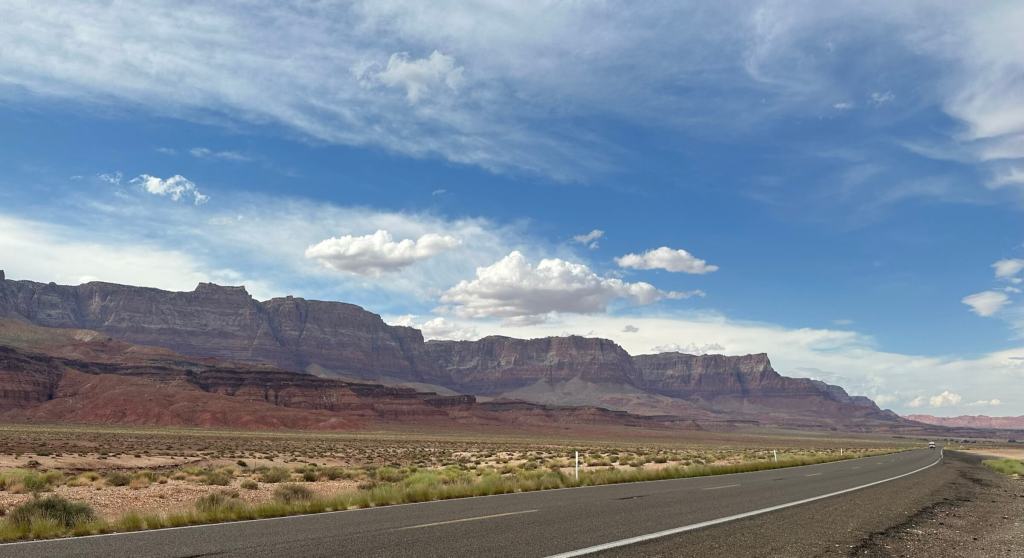 - Hwy 89A and Hwy 89 were pretty spectacular driving. We passed through Cliff Dwellers on the way and the view turned crazy pretty. You also get to drive by the Vermillion Cliffs which are also just stunning. Altogether it’s about a 3 1/2 hour drive if you don’t stop. You’ll want to stop. We certainly did although not enough. We saw several people boon docking off of 89A where they had some great views so something to keep in mind. Here’s a picture of the roadside views. My phone says Marble Canyon. It’s at mile marker 553.