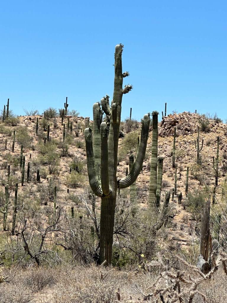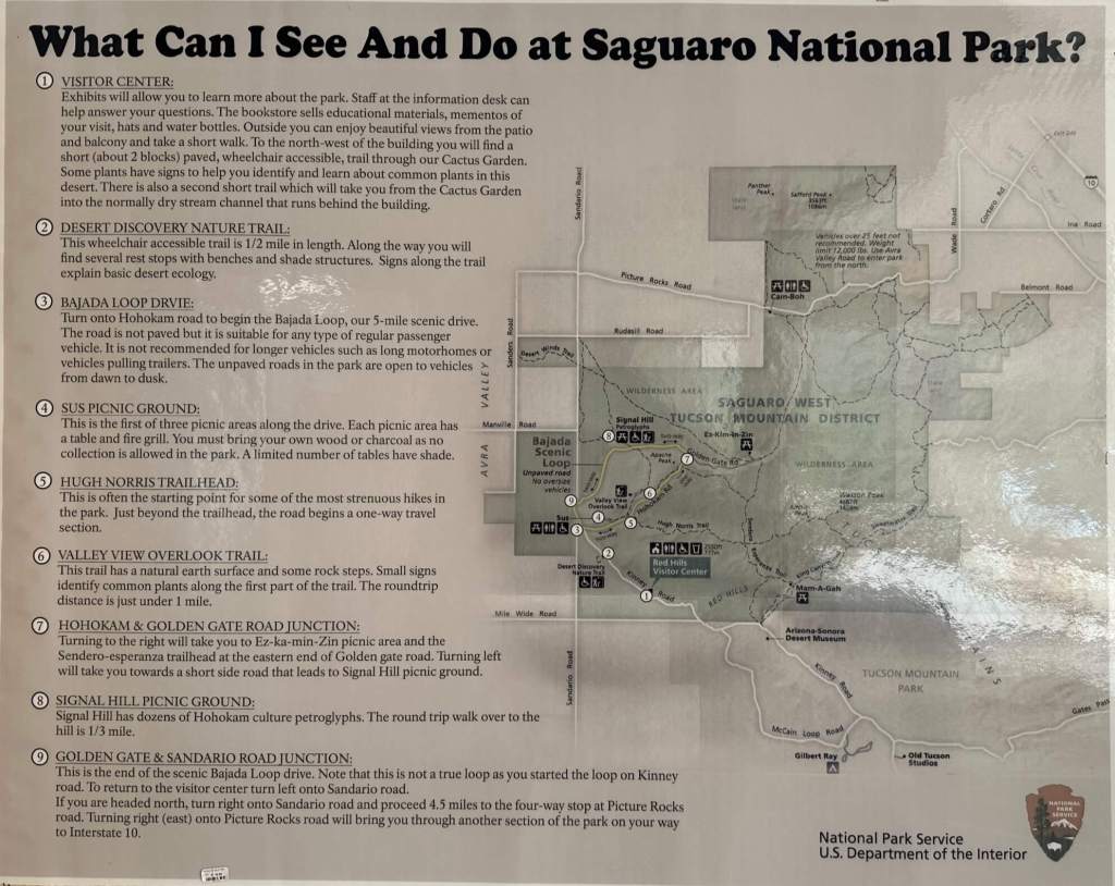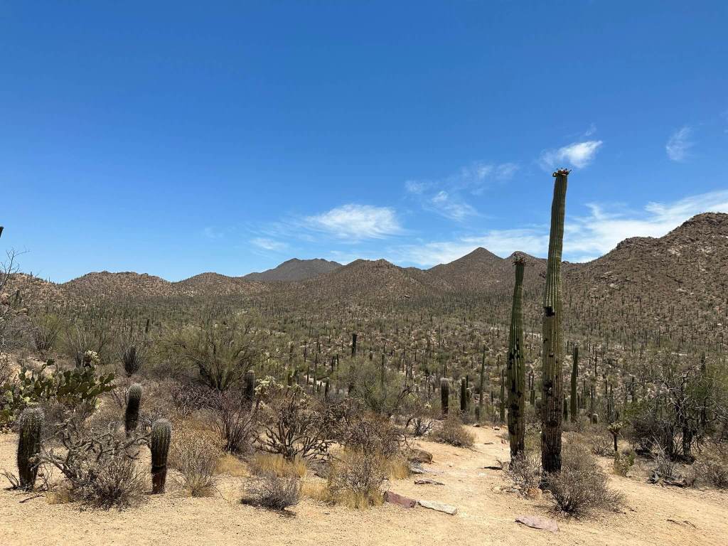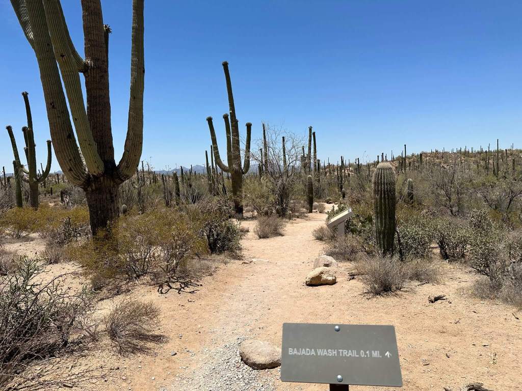 - The scenic loop is a rock road so we had to go slow which was fine since I was like a kid in the proverbial candy store looking at the Saguaros. It was pretty hot (about 101 degrees) however I did do the Bajada Wash Trail and took it up to the top of the hill so I could get a good view of the valley and I don’t know how many Saguaros. (thousands probably). It was a really hot but very rewarding hike! Lots of Saguaros in different shapes, sizes, configurations and such.
