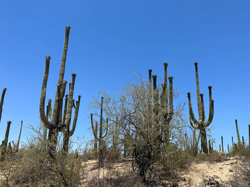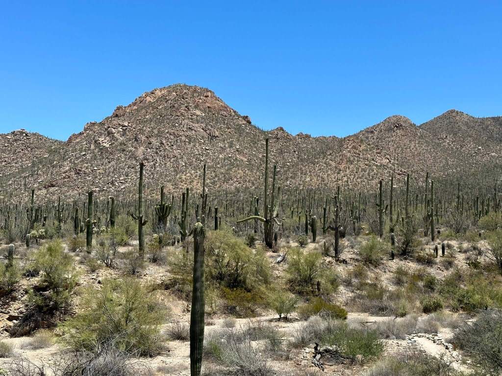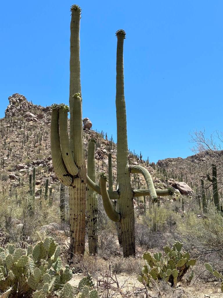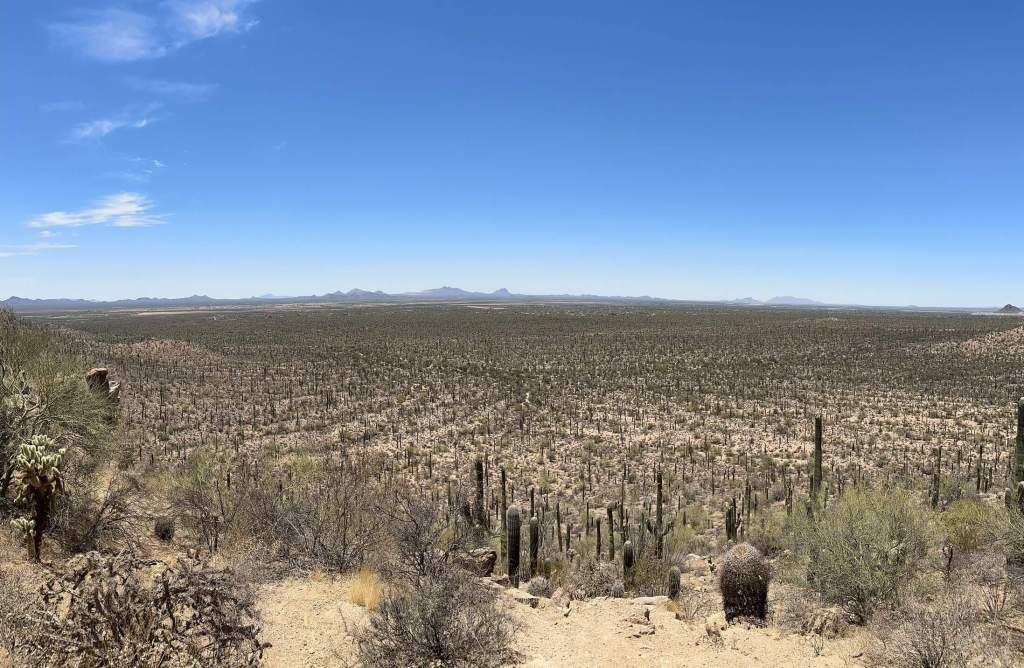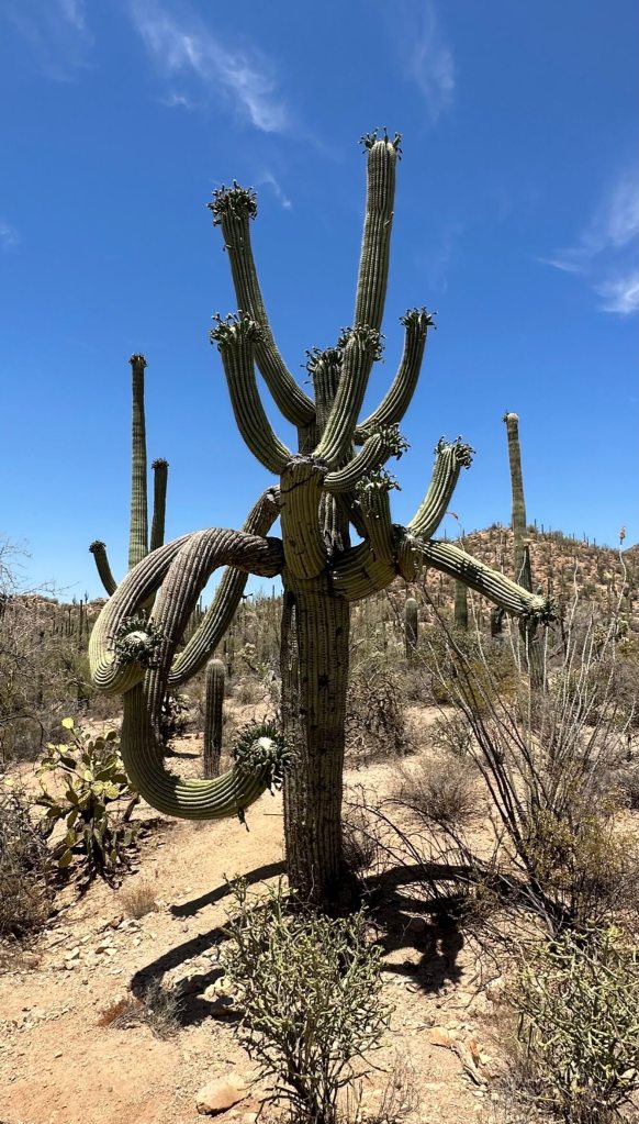 - The scenic loop is a rock road so we had to go slow which was fine since I was like a kid in the proverbial candy store looking at the Saguaros. It was pretty hot (about 101 degrees) however I did do the Bajada Wash Trail and took it up to the top of the hill so I could get a good view of the valley and I don’t know how many Saguaros. (thousands probably). It was a really hot but very rewarding hike! Lots of Saguaros in different shapes, sizes, configurations and such.